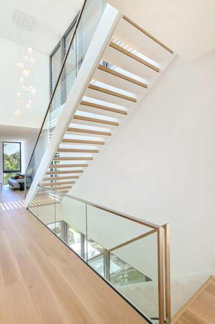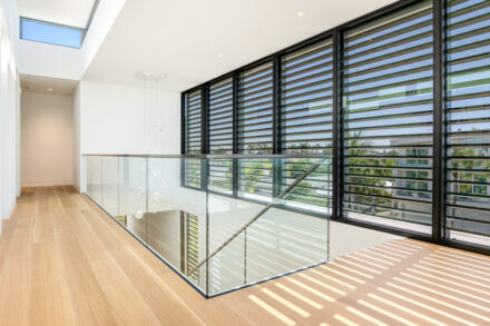 • Modern interior and frameless exterior glass railing