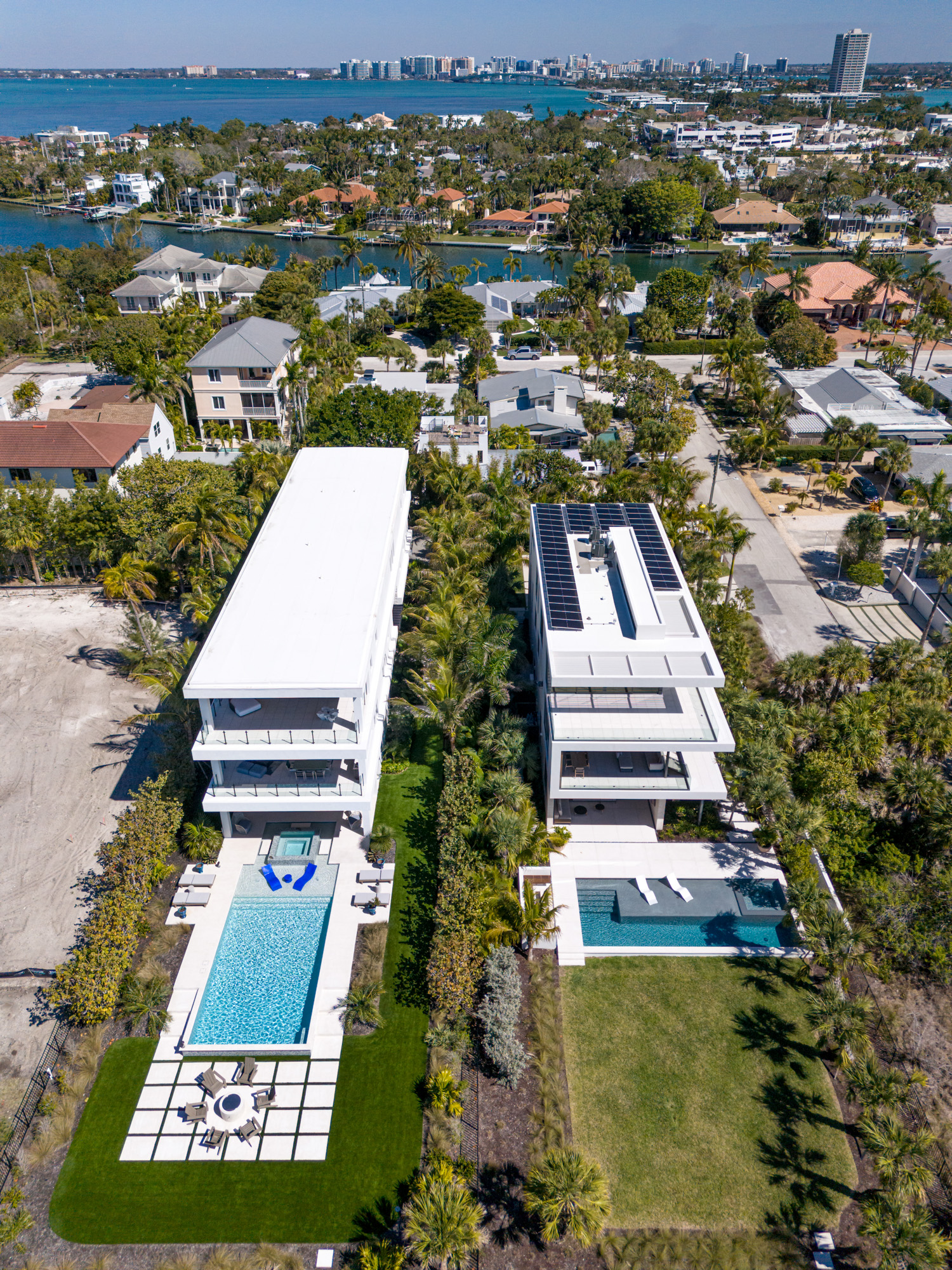 A project highlighting a stunning blend of form and function, captured through a combination of aerial drone and ground-level photography. This Lido Key custom home features a range of bespoke architectural elements, including: