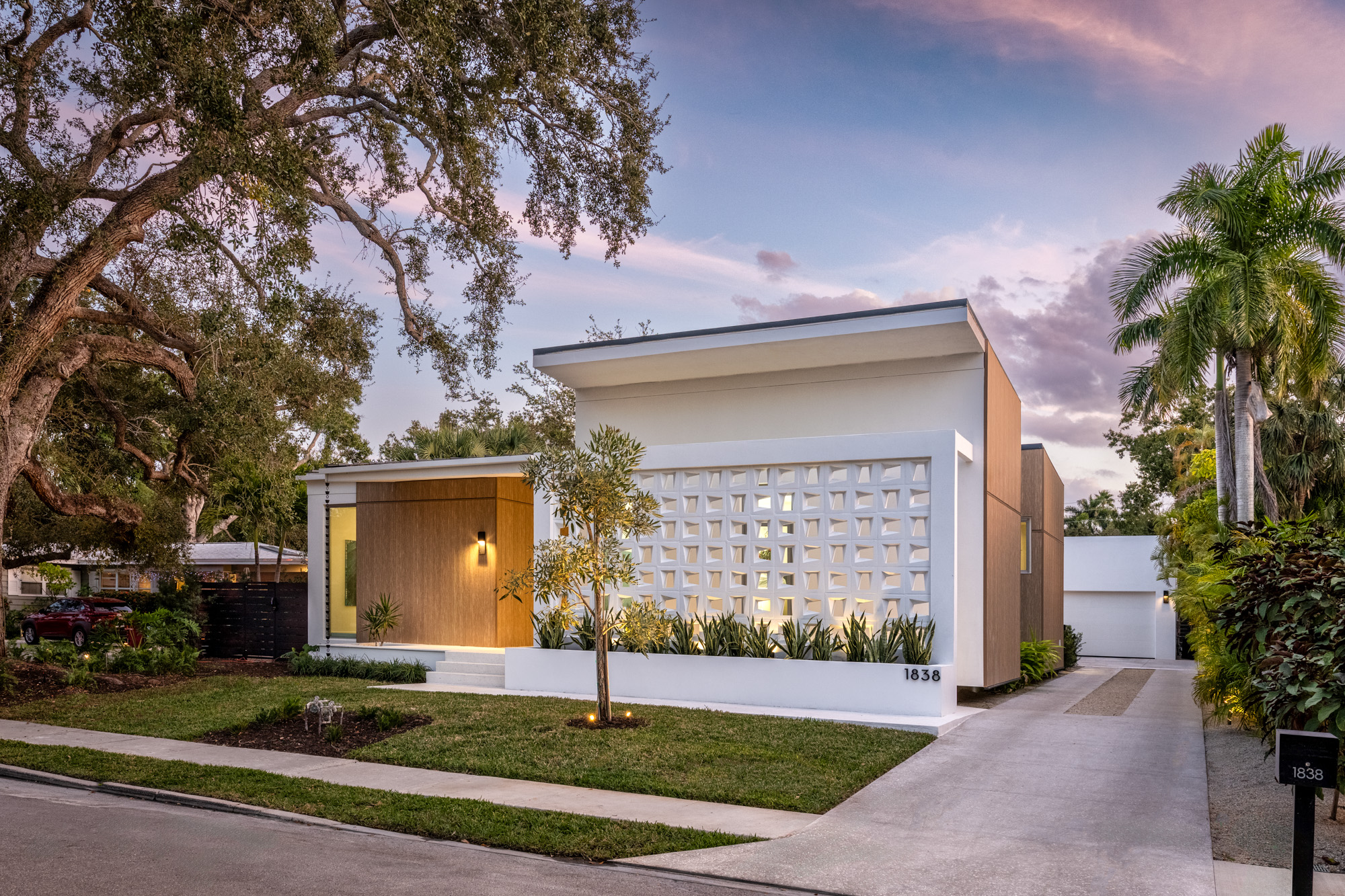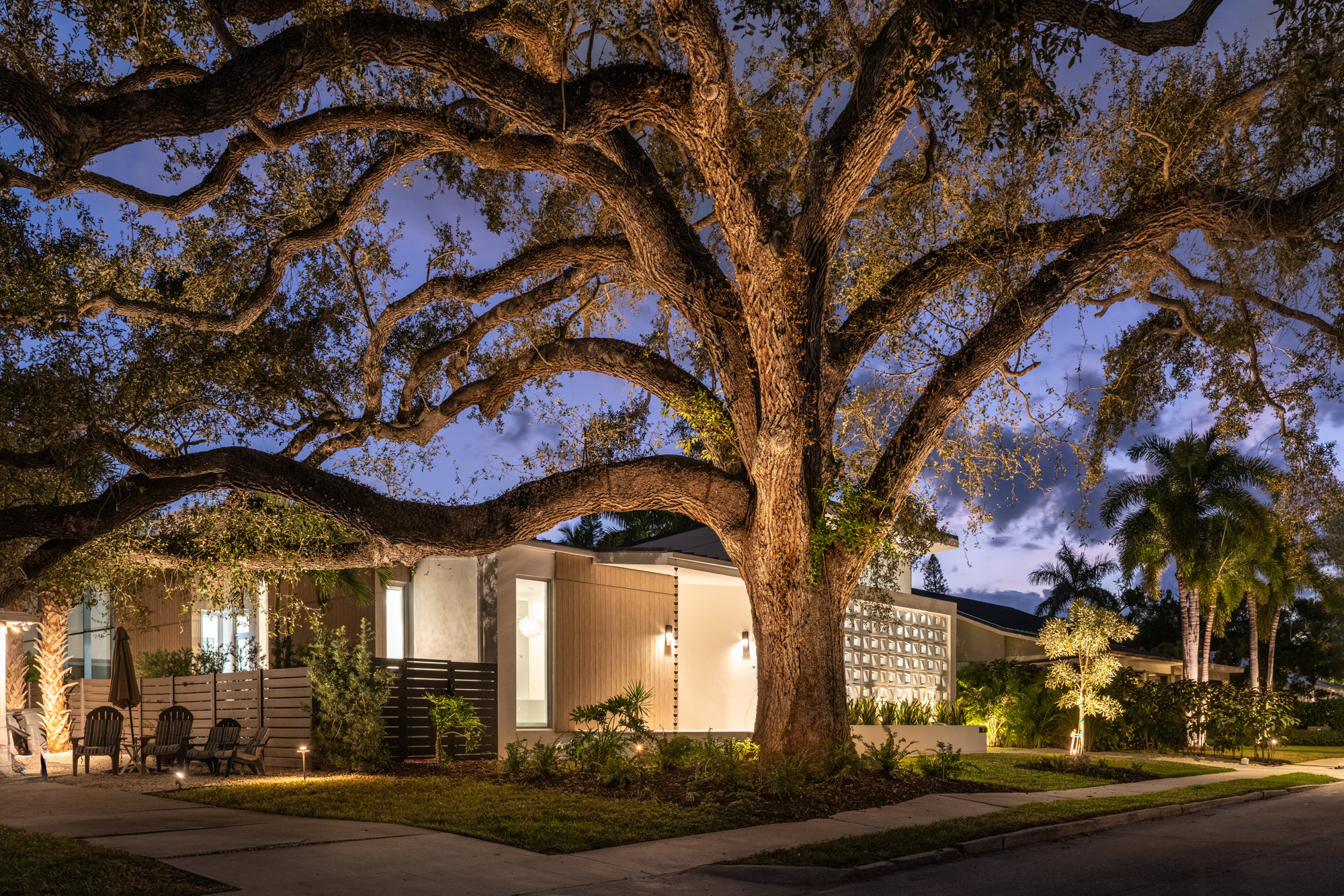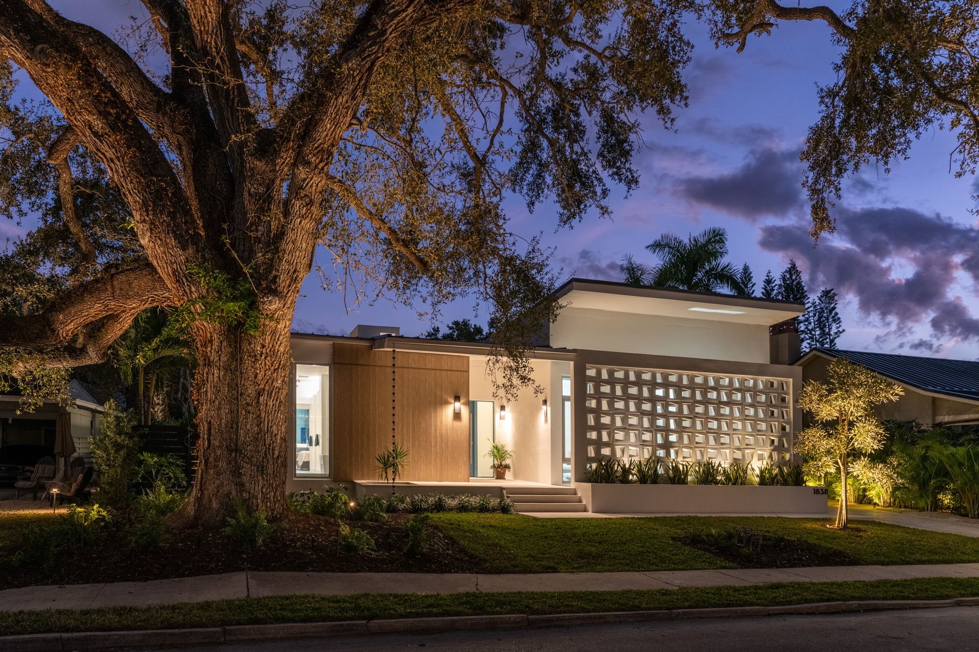 An architectural photograph of a modern residence in the Avondale Park Community Sarasota, Fl with custom breeze block and a large oak tree against a dusk sky
