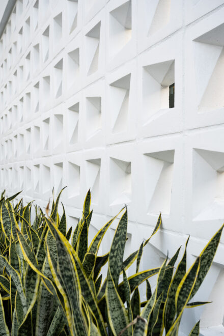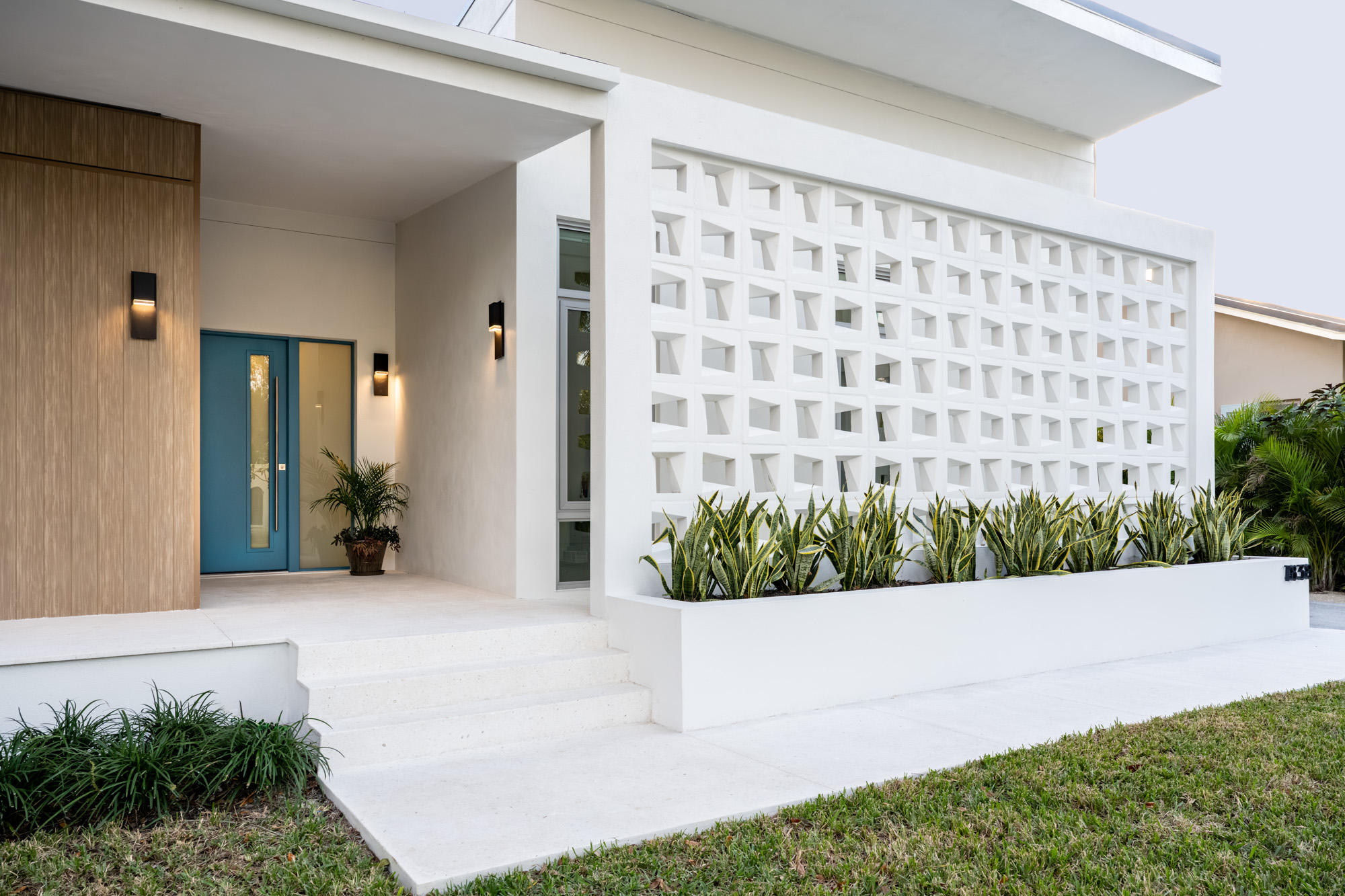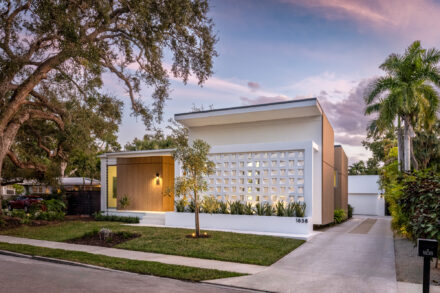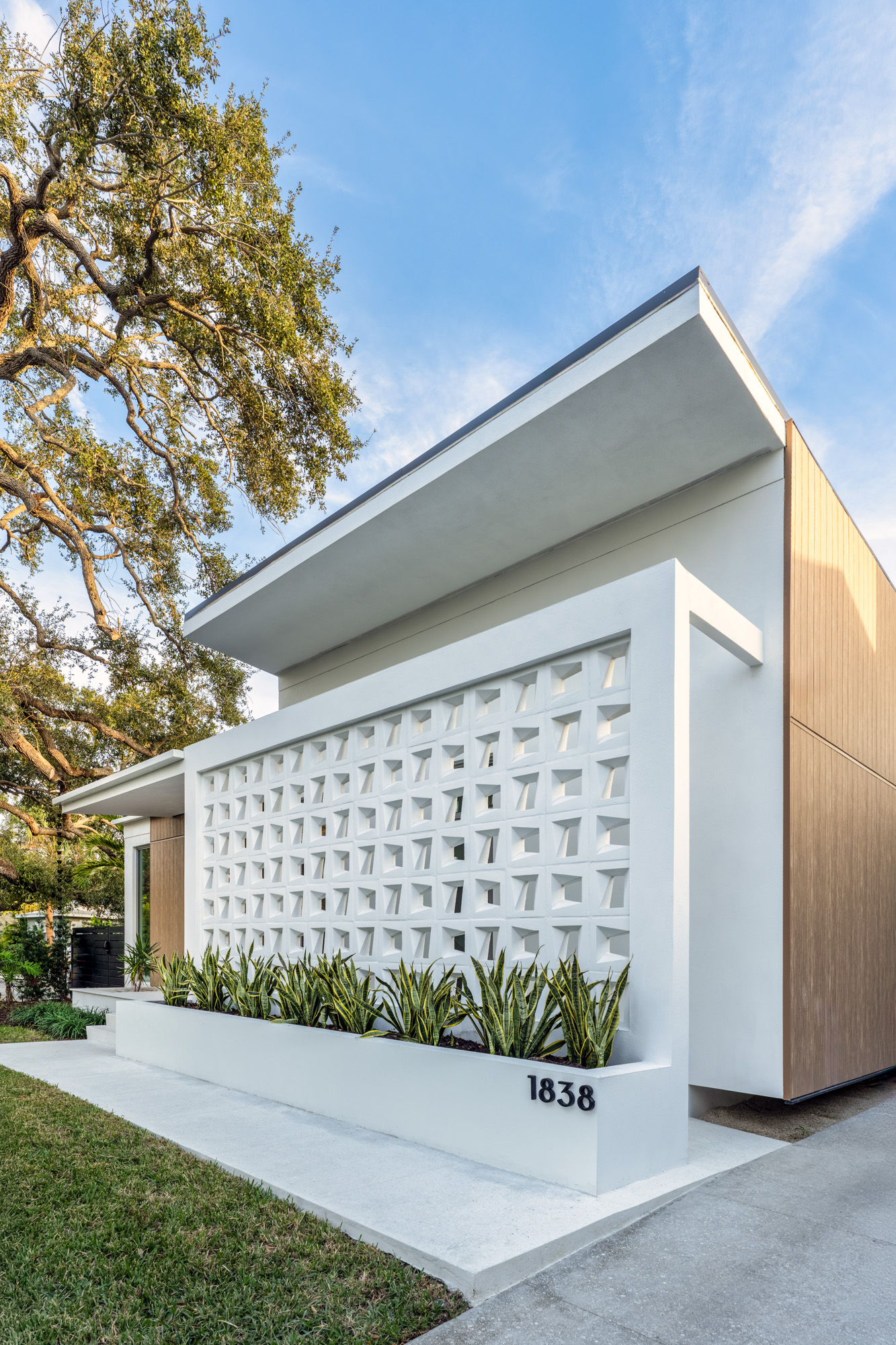 An architectural photograph of a modern residence in the Avondale Park Community Sarasota, Fl with custom breeze block and a large oak tree against a dusk sky