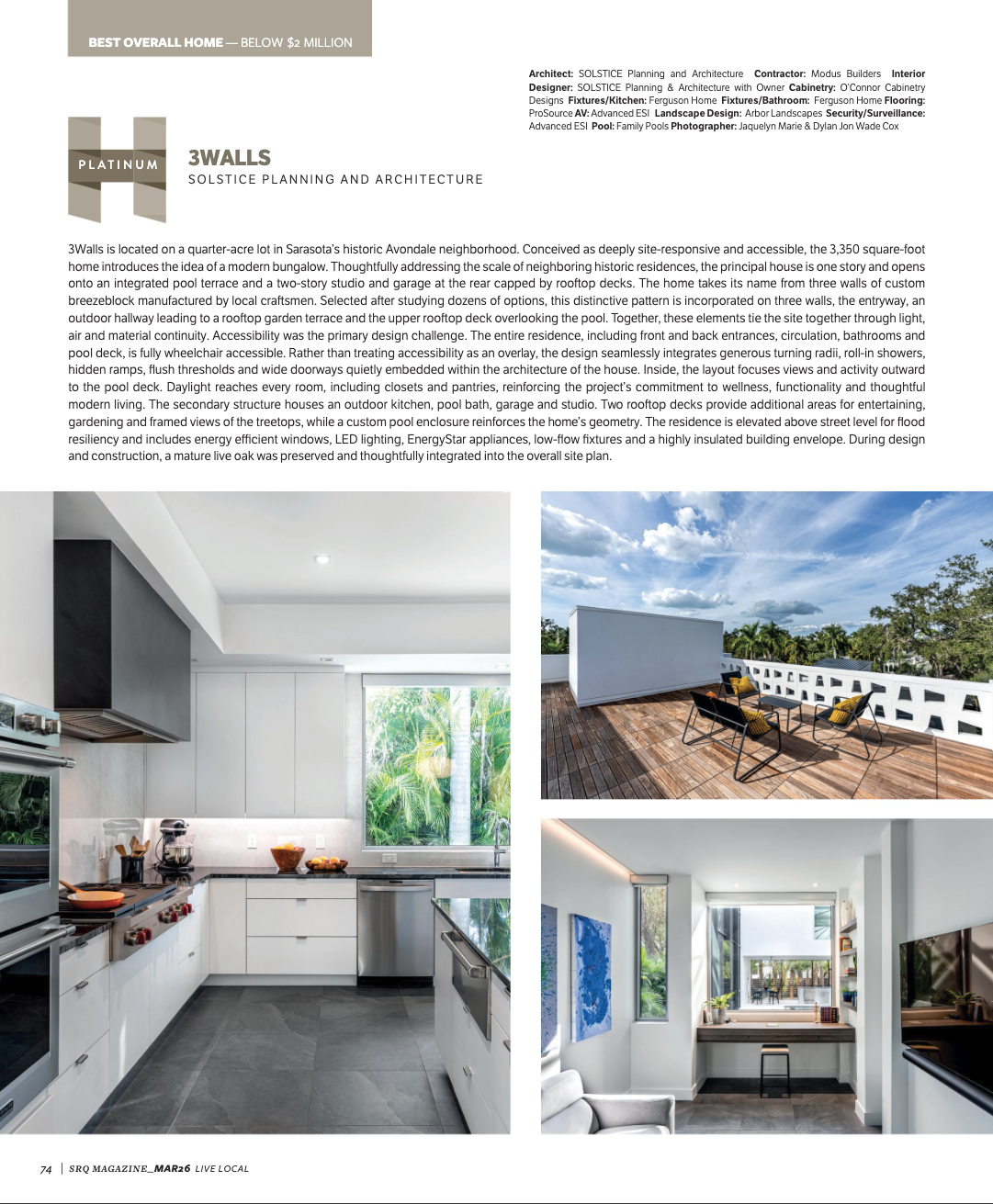 It was an honor to document 3Walls, a custom residential project located in Sarasota’s Historic Avondale neighborhood. This modern bungalow recently received the SRQ Magazine Platinum Home of the Year Award 2026, recognizing the strength of its design and execution by the builder and architect.
