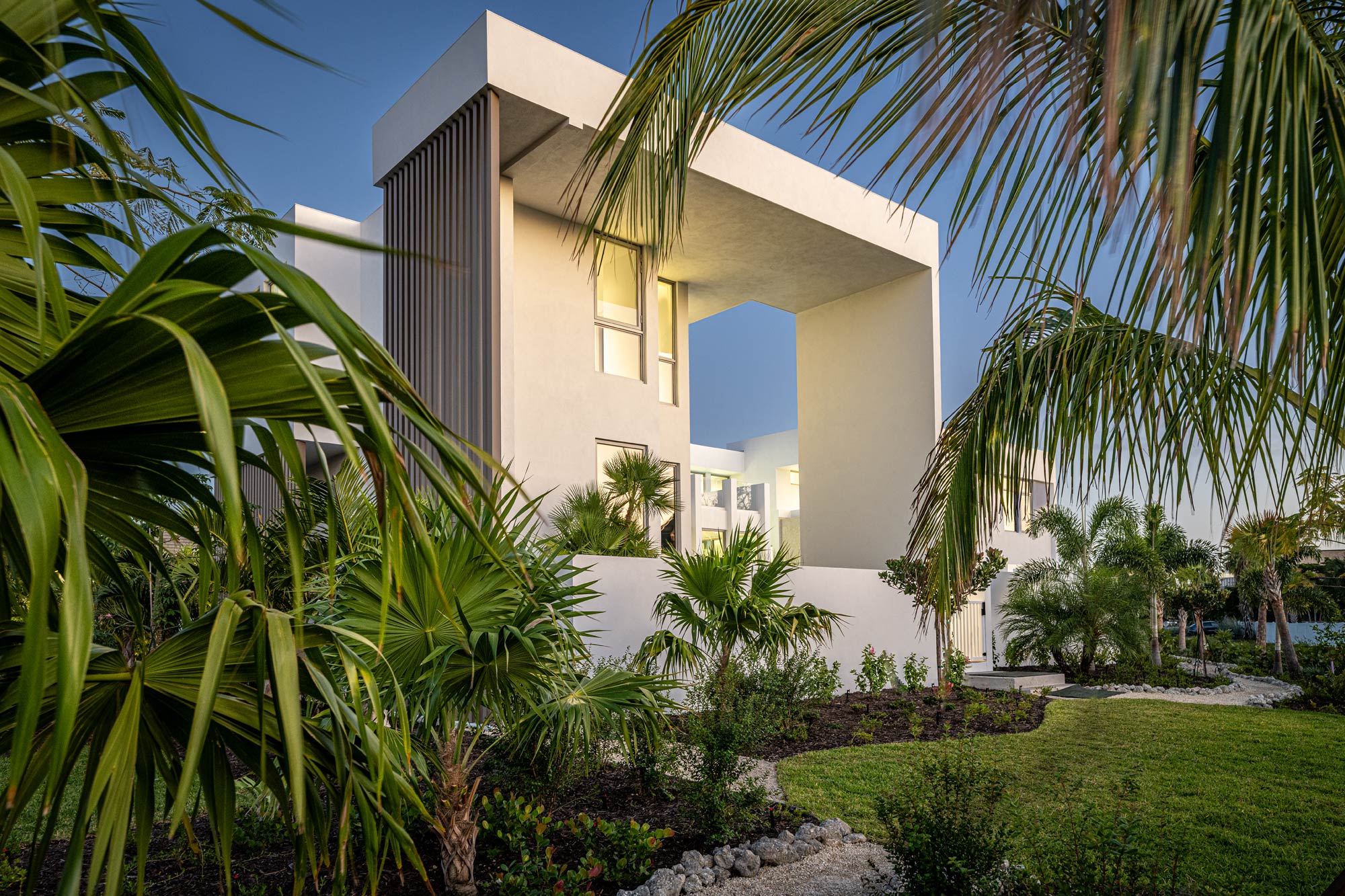 The front elevation features vertical sunshades that provide solar control, privacy, and visual rhythm across the façade. From a commercial architectural photography standpoint, these elements are best captured by emphasizing repetition, shadow patterns, and material consistency.