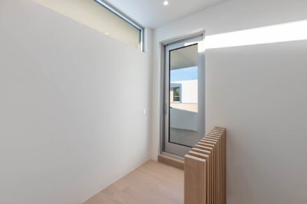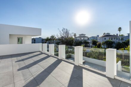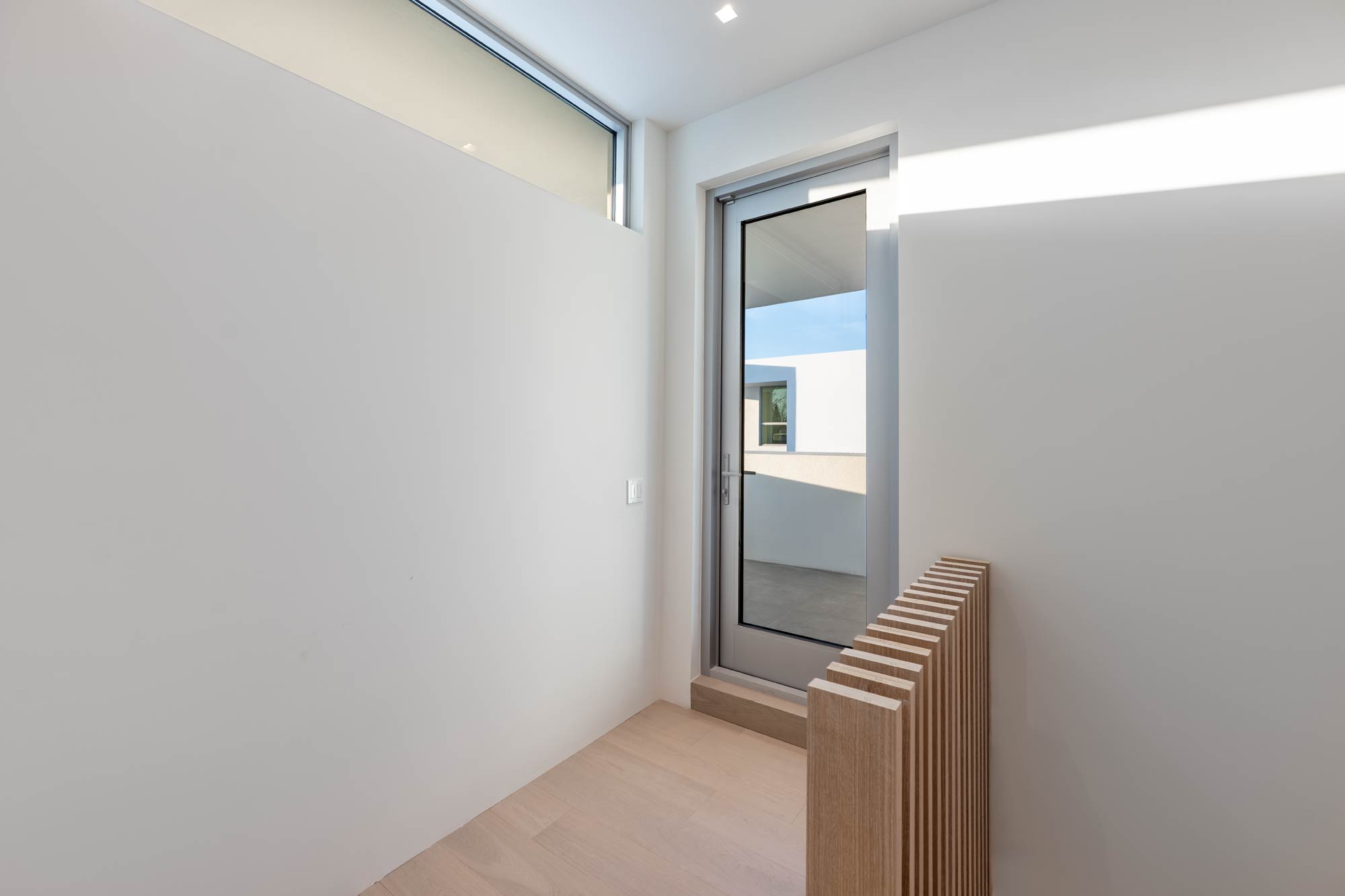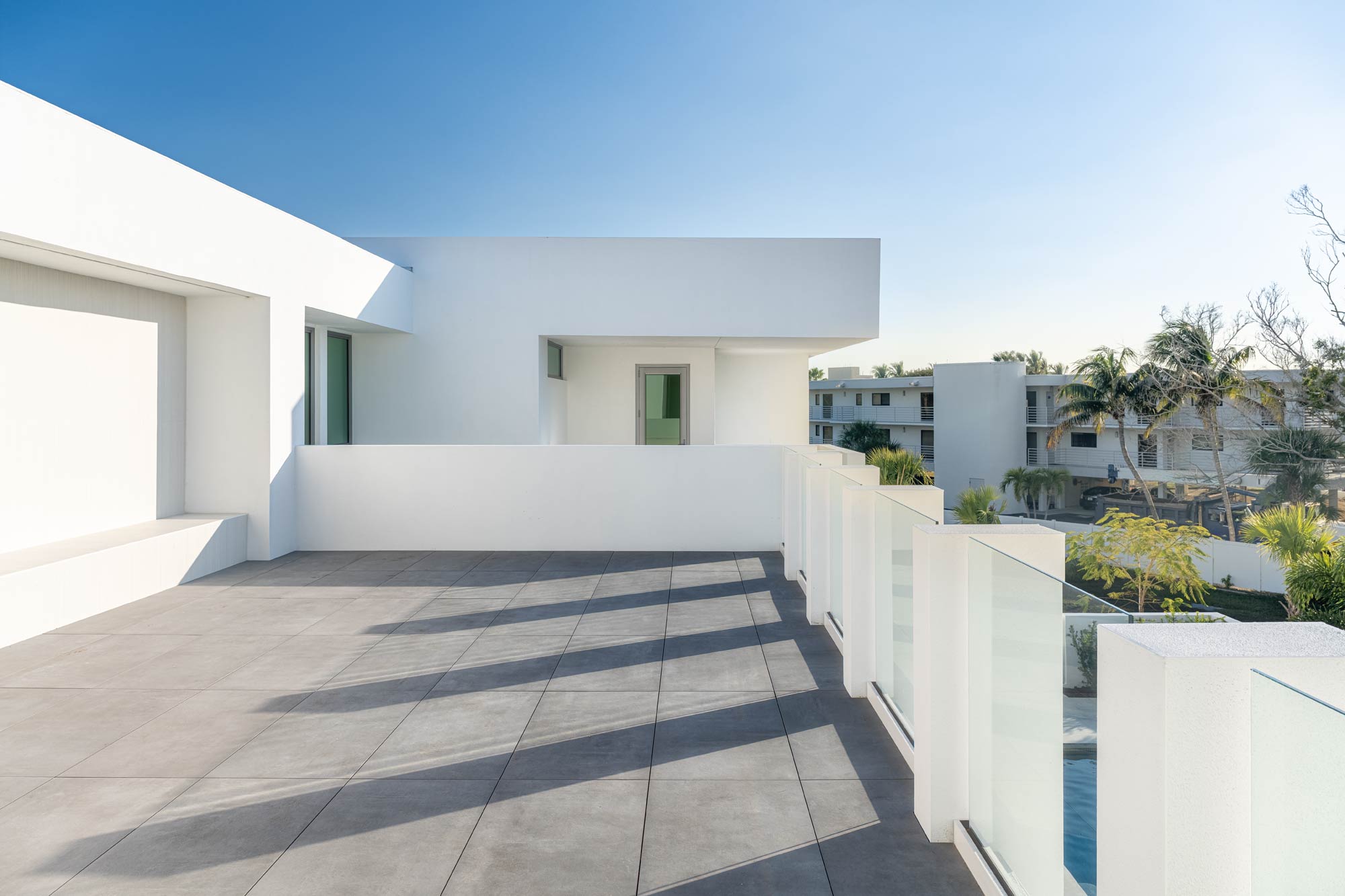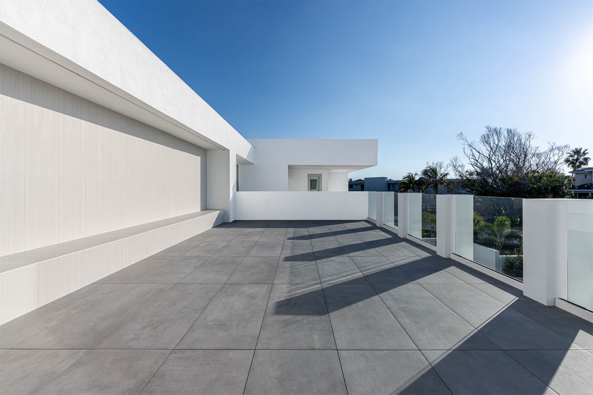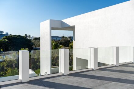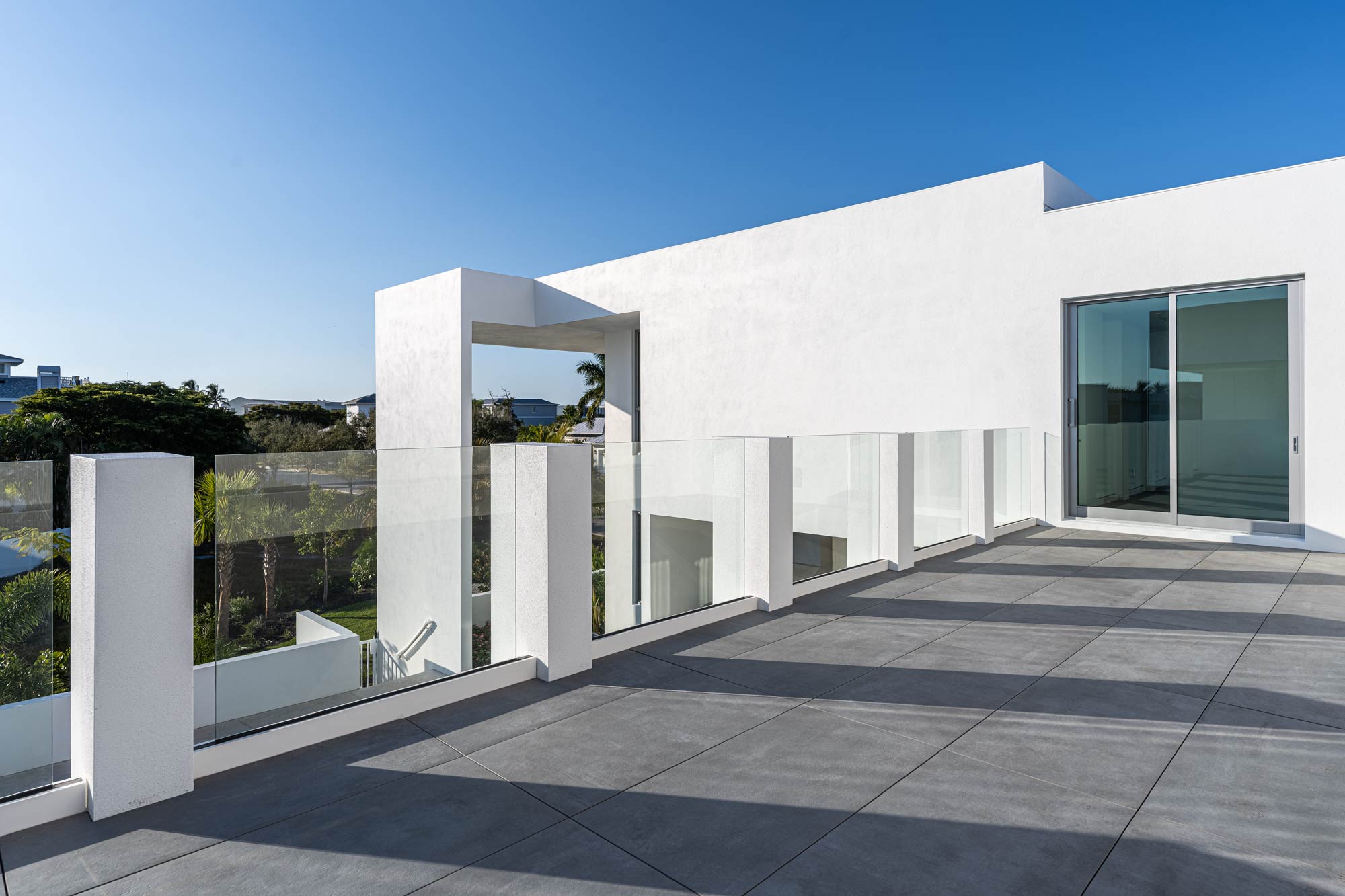 The upper roof deck includes a minimalist glass railing system designed to preserve views and maintain a clean architectural profile. Glass railing photography requires careful management of reflections, glare, and background distractions to ensure the system reads clearly and intentionally.