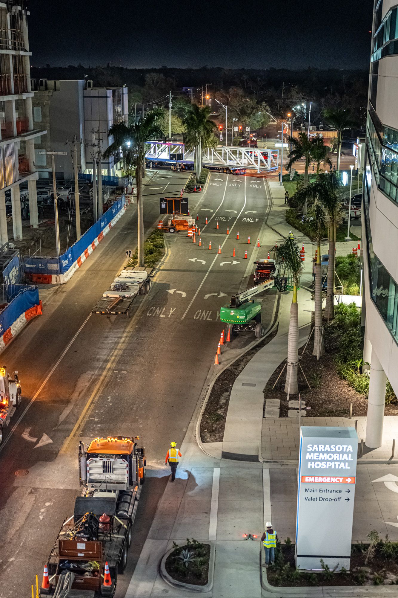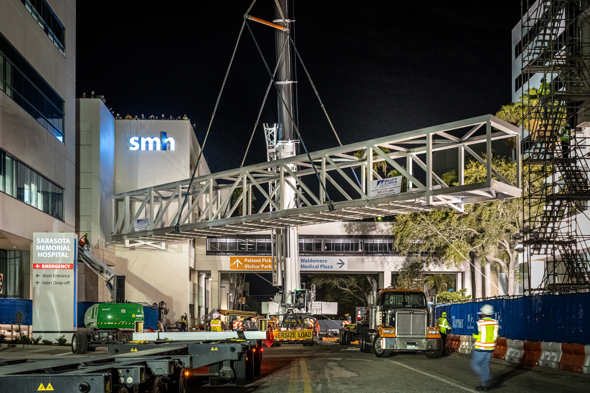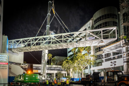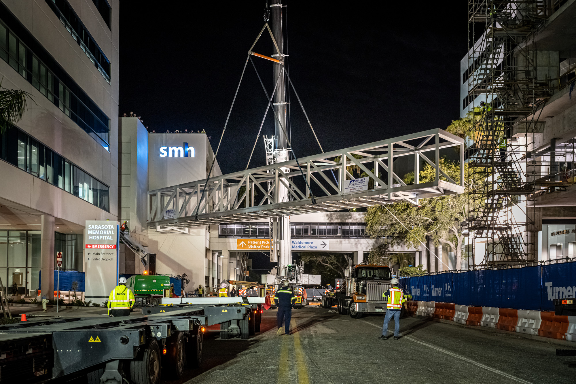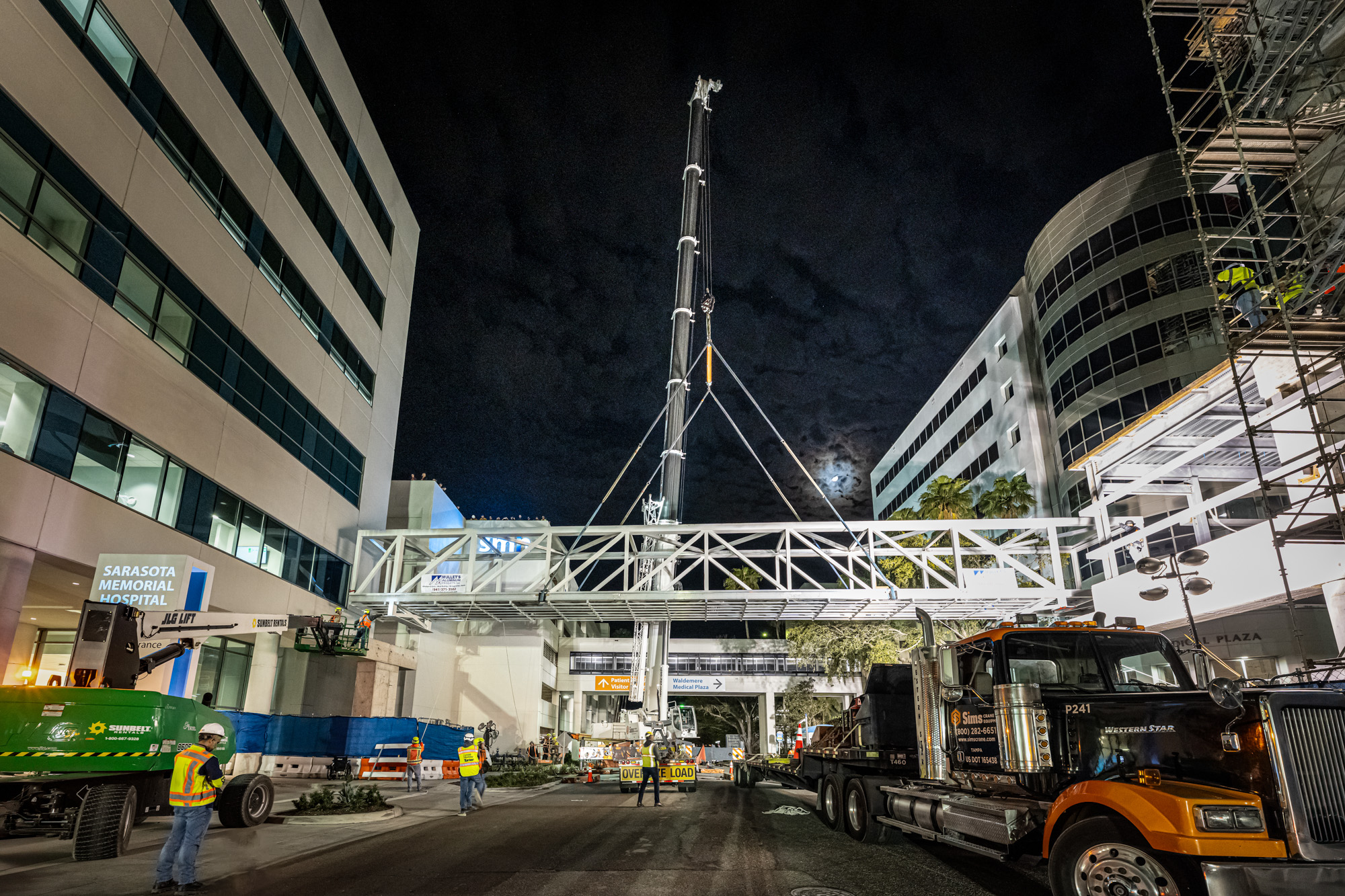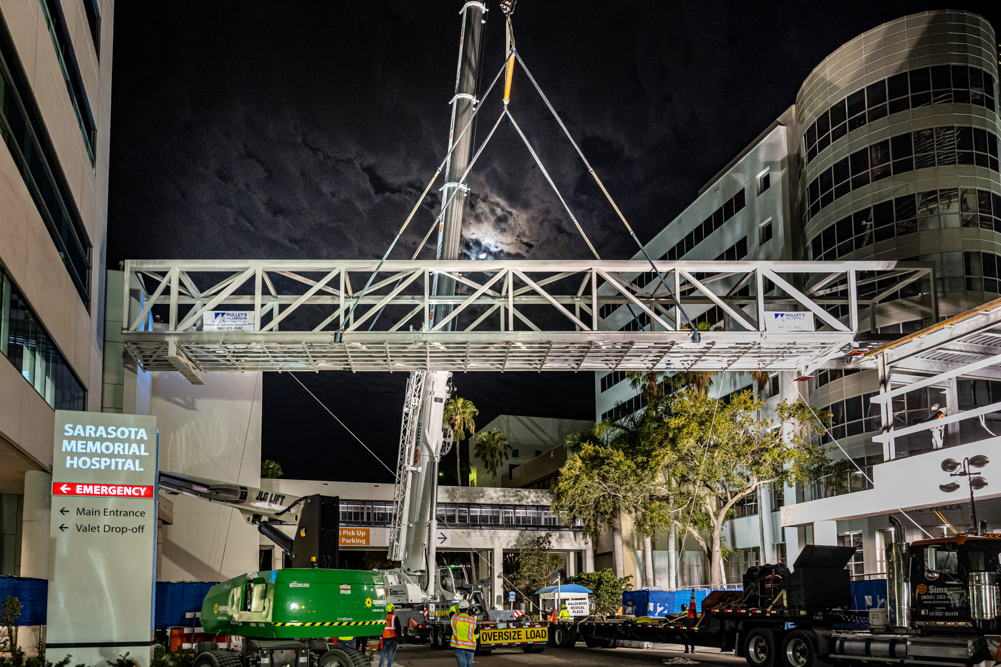 The aluminum skeleton of a massive 114′ pedestrian bridge is craned into place at Sarasota Memorial Hospital