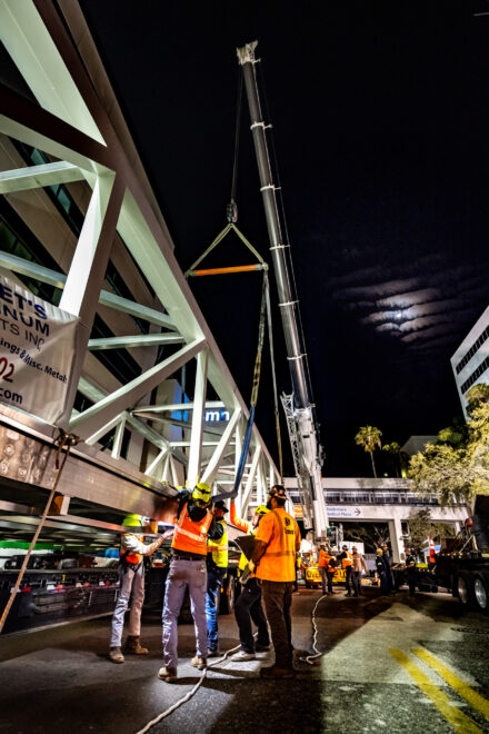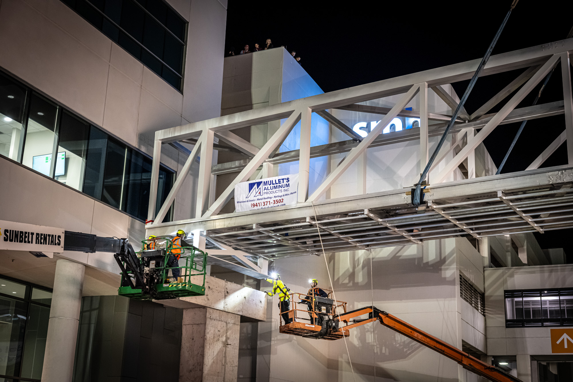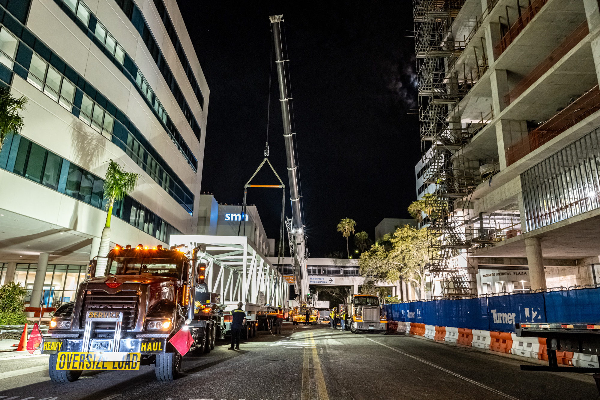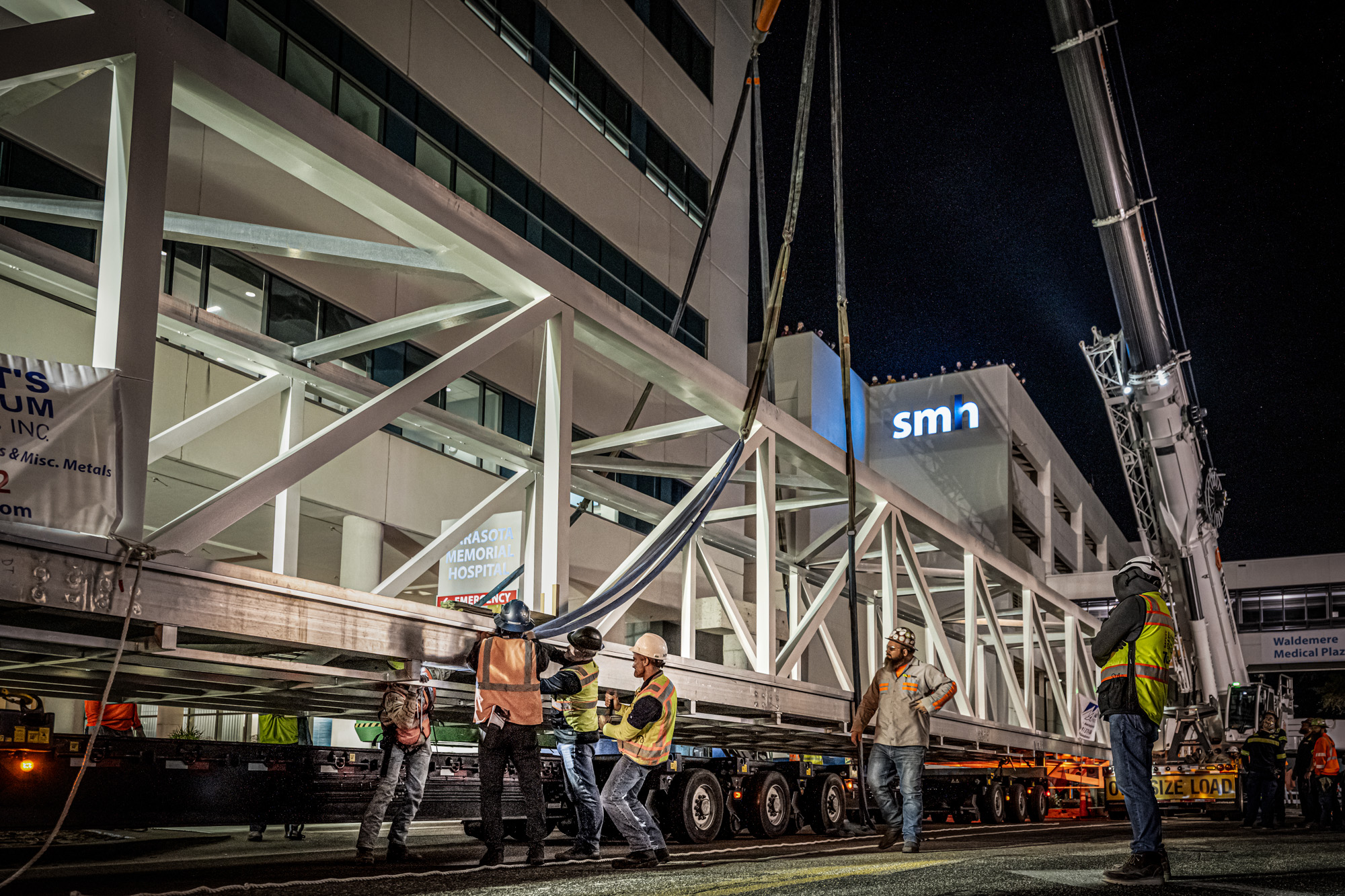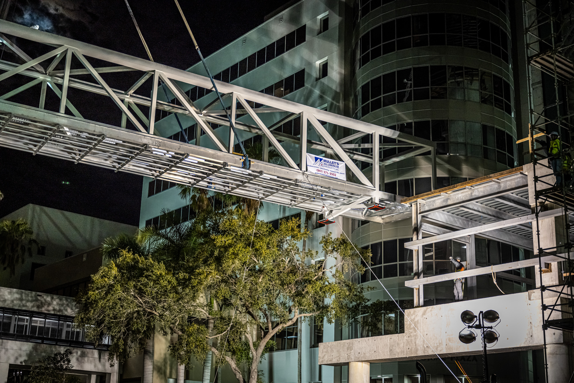 The aluminum skeleton of a massive 114′ pedestrian bridge is craned into place at Sarasota Memorial Hospital