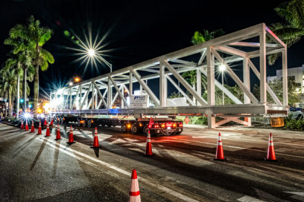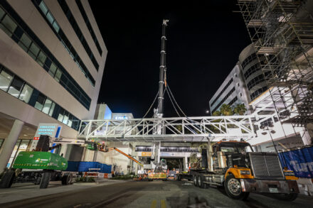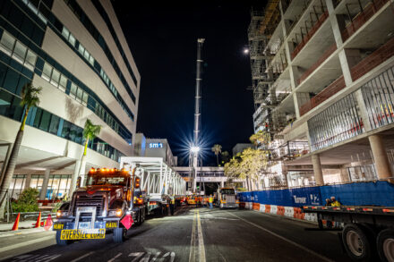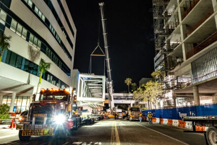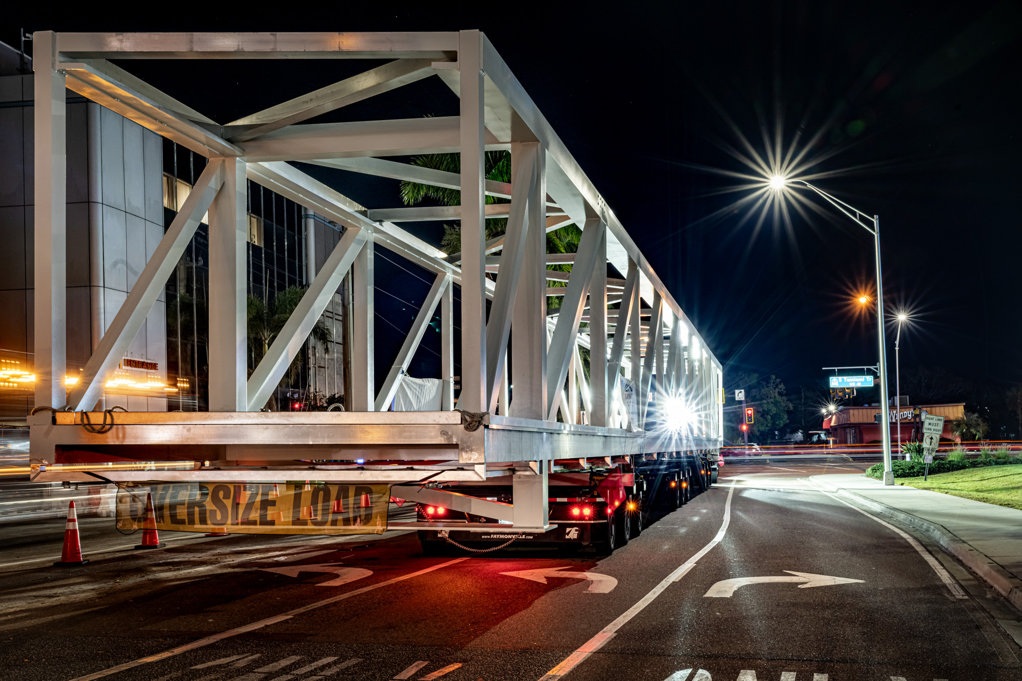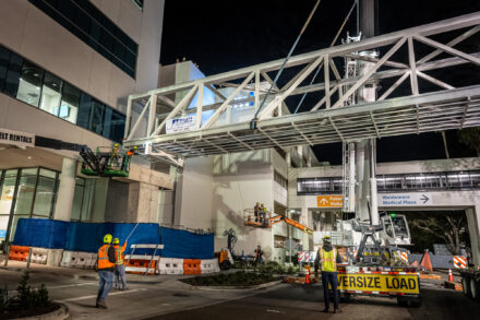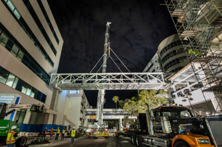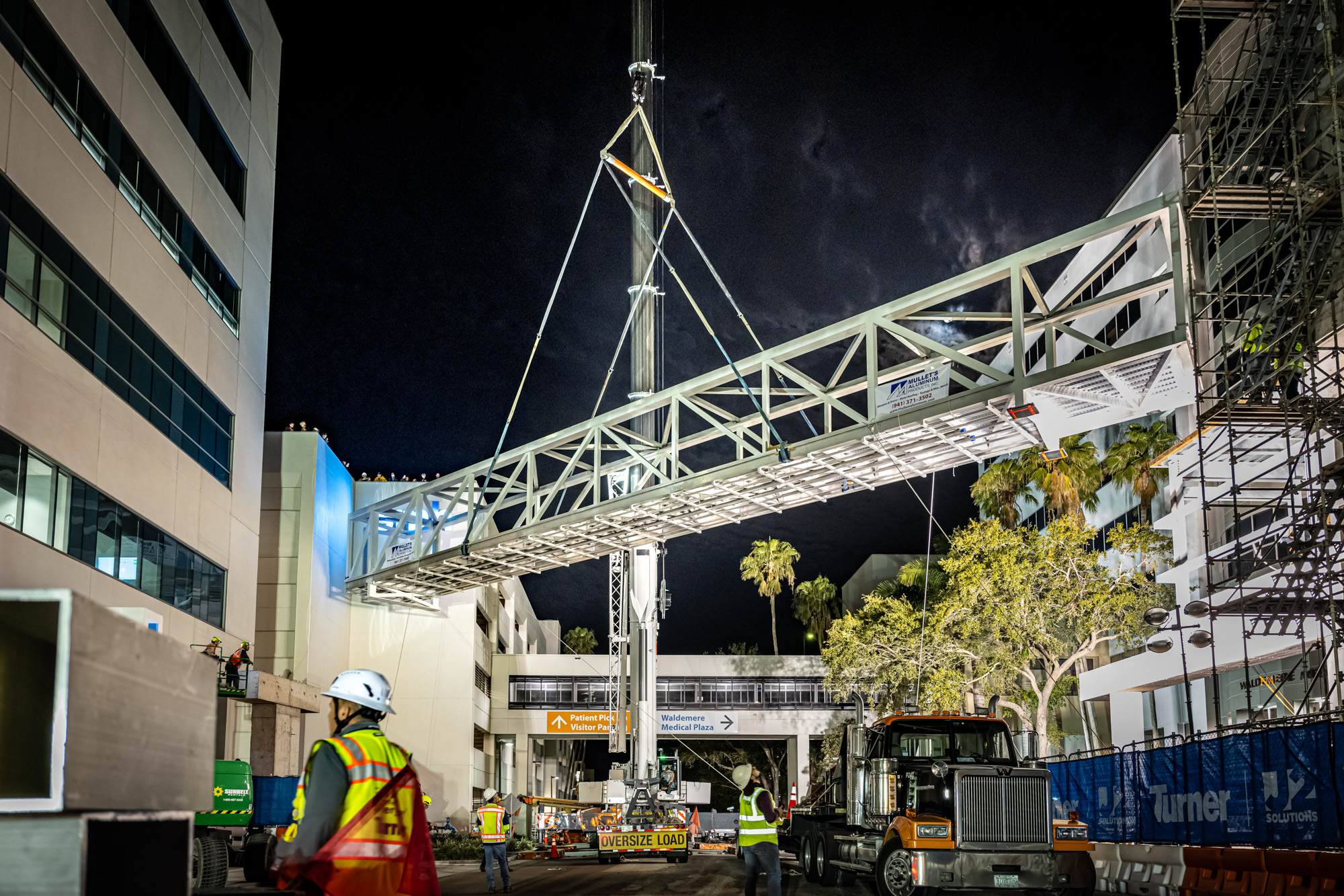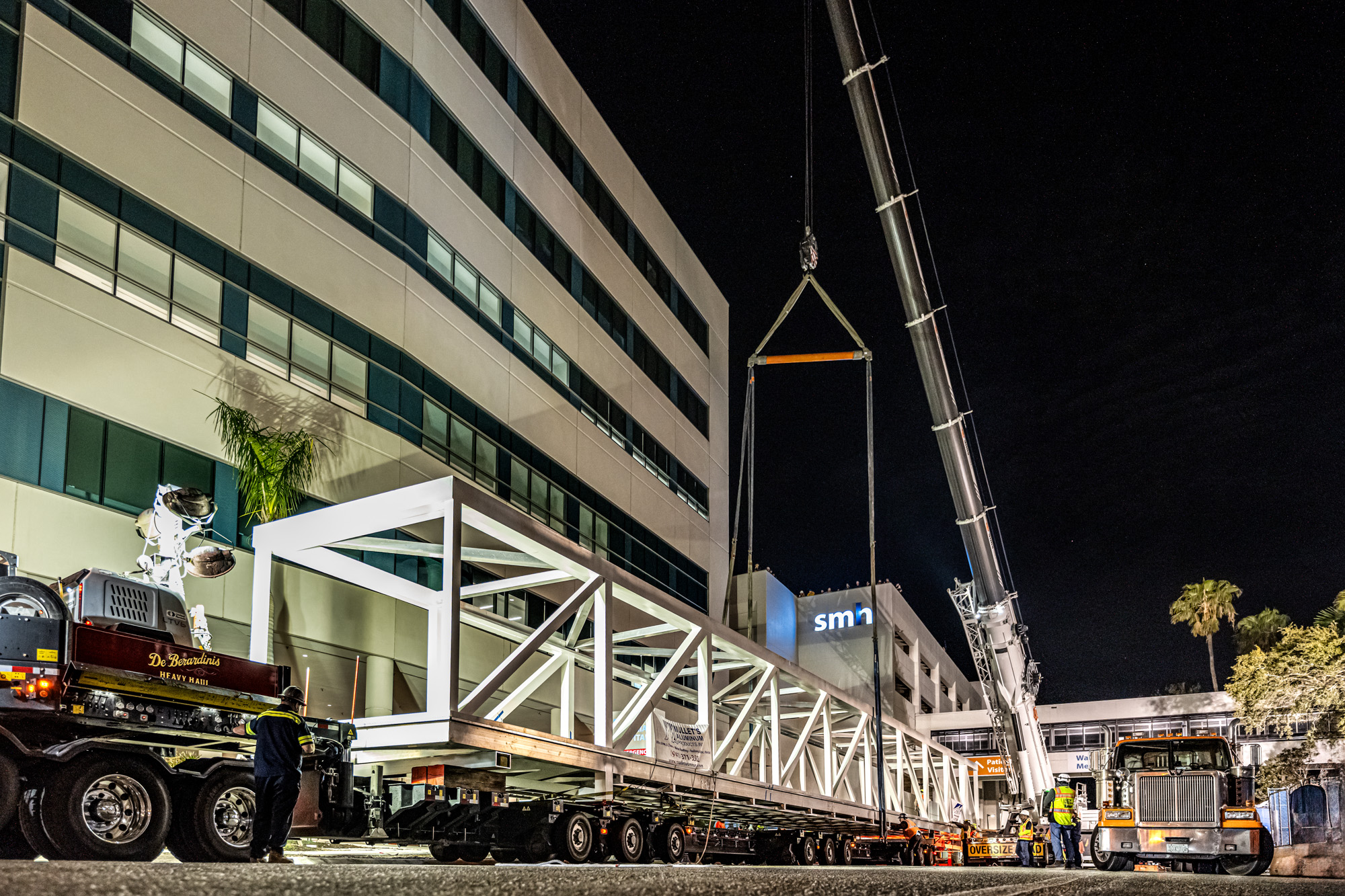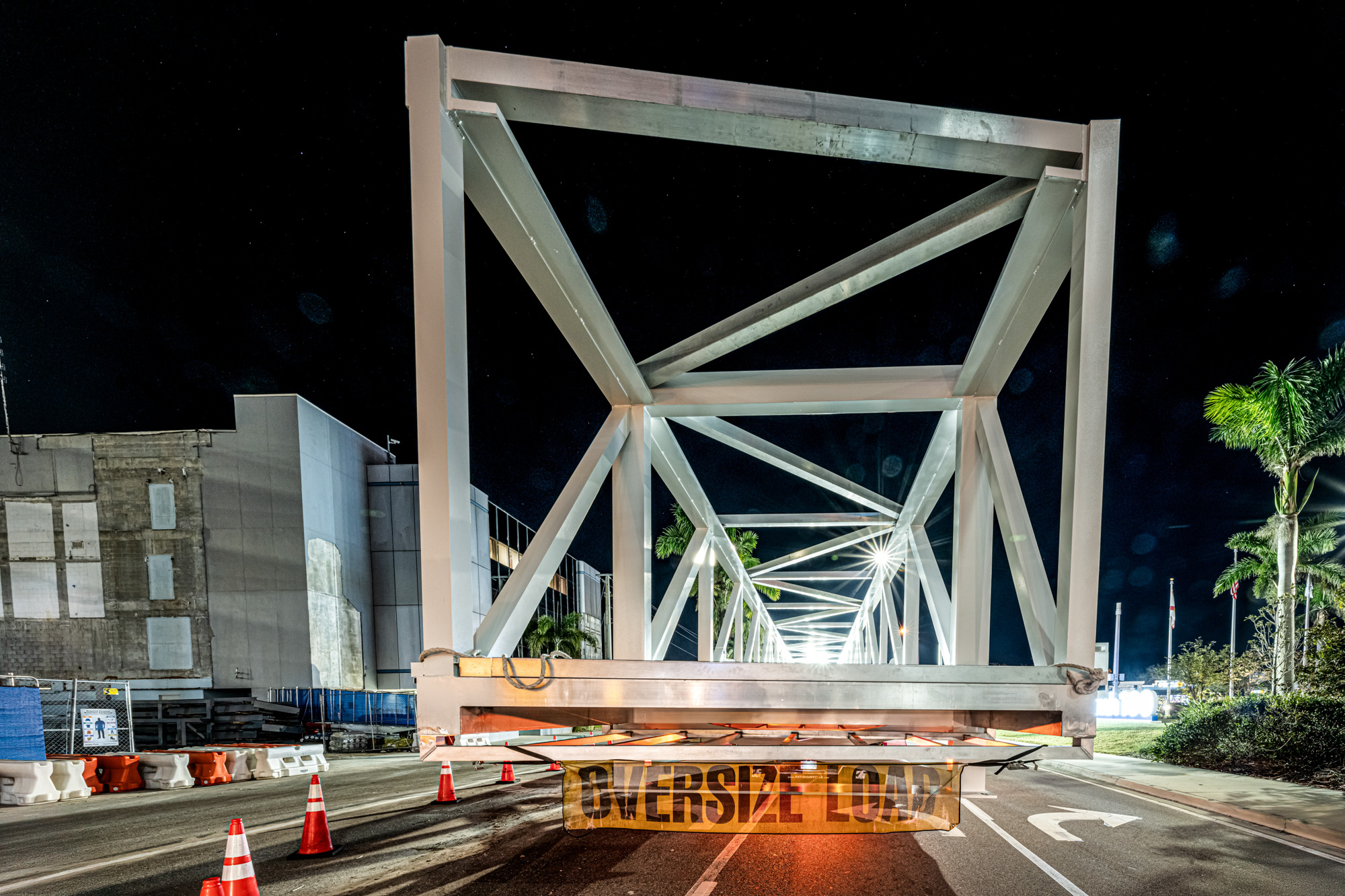 The aluminum skeleton of a massive 114′ pedestrian bridge is craned into place at Sarasota Memorial Hospital