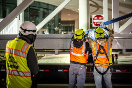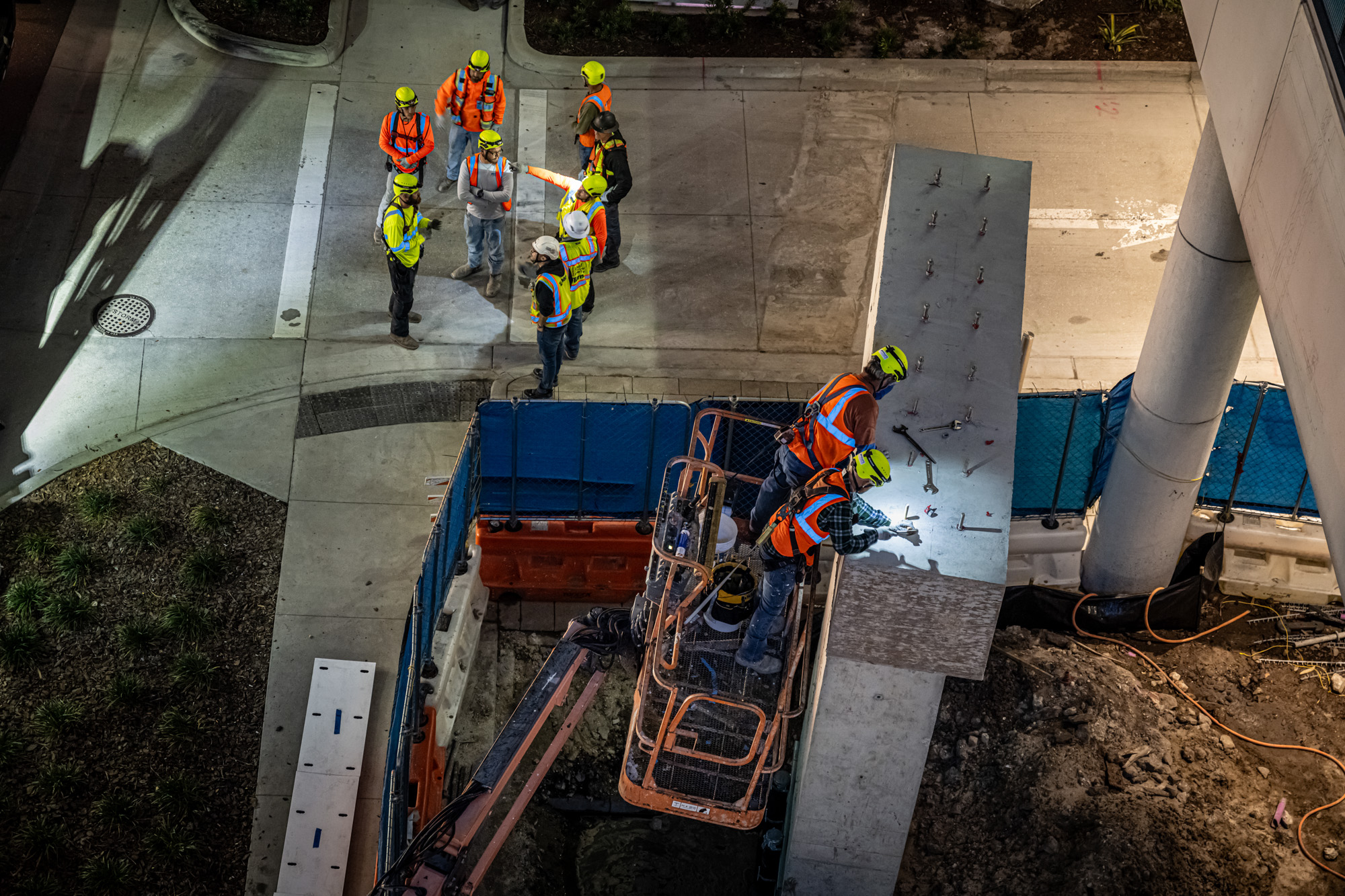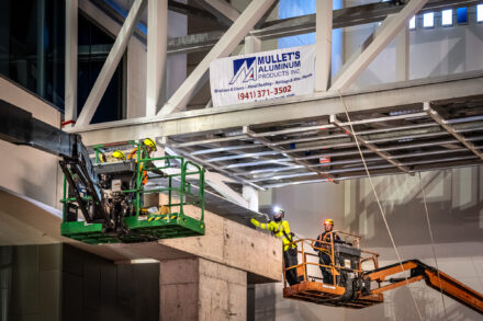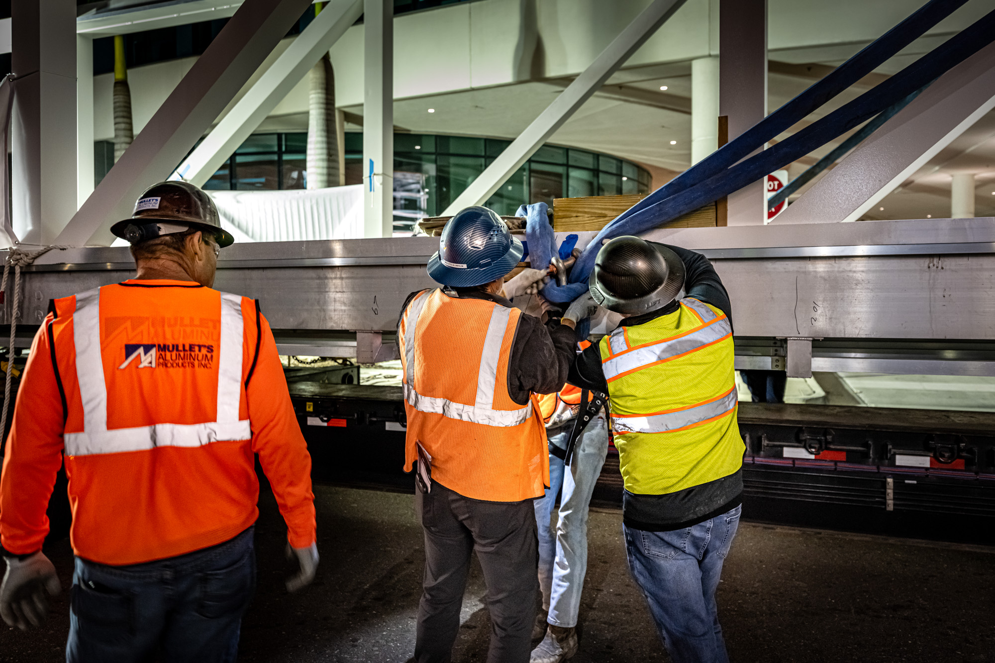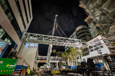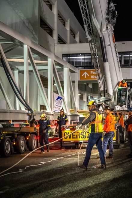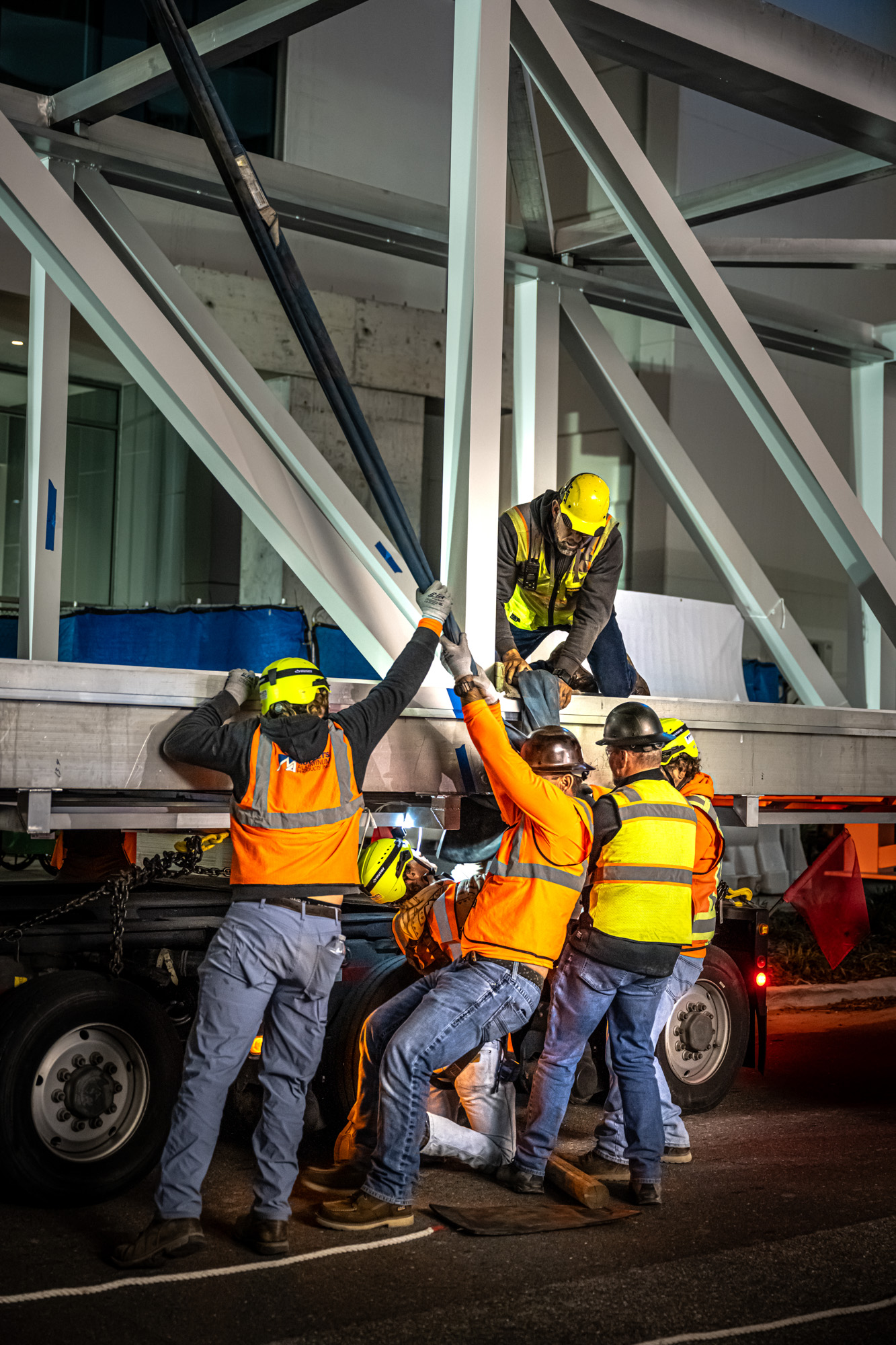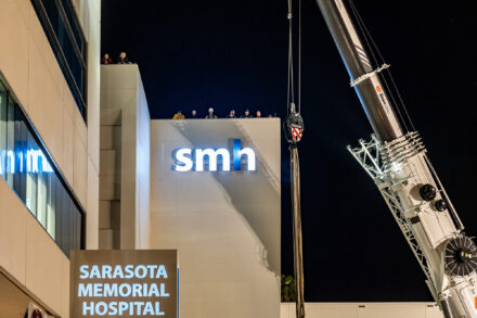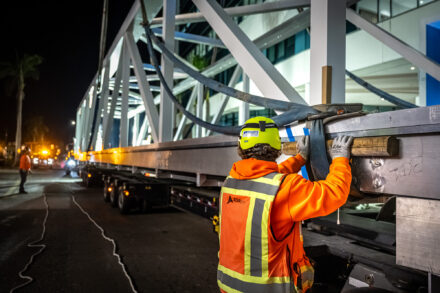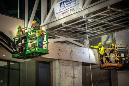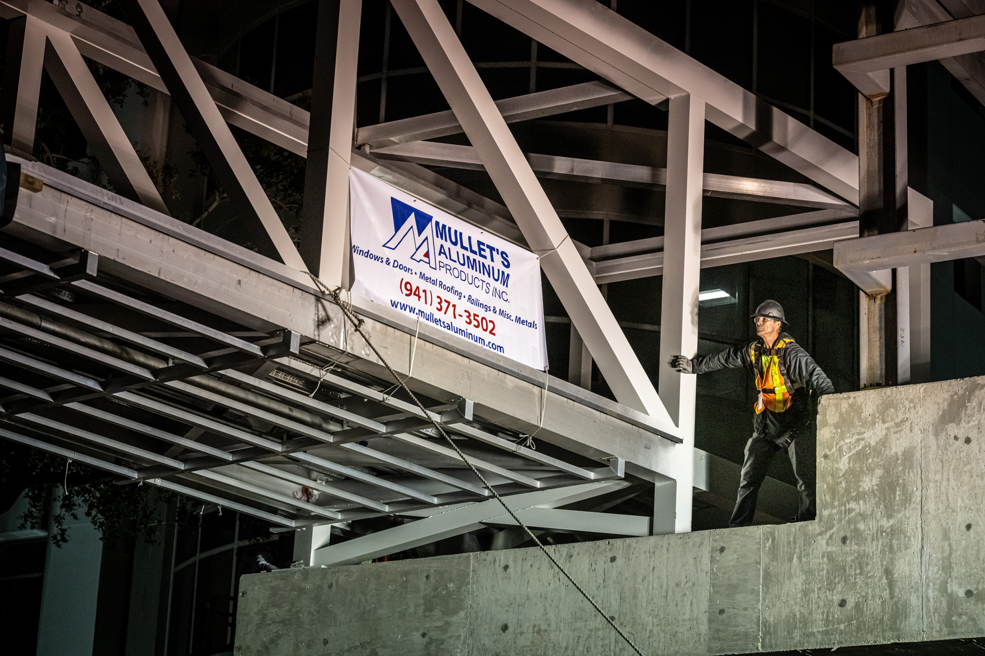 The aluminum skeleton of a massive 114′ pedestrian bridge is craned into place at Sarasota Memorial Hospital