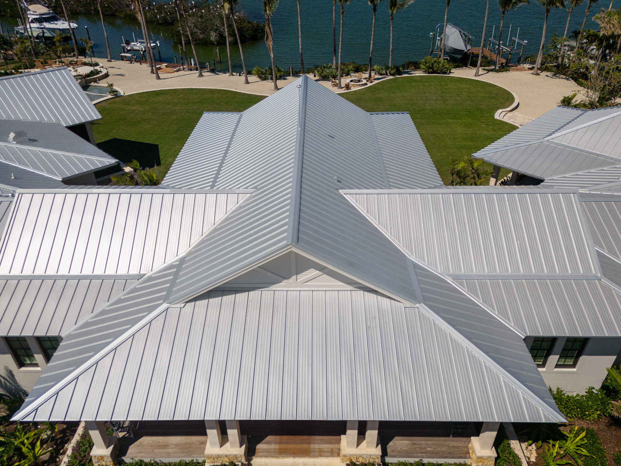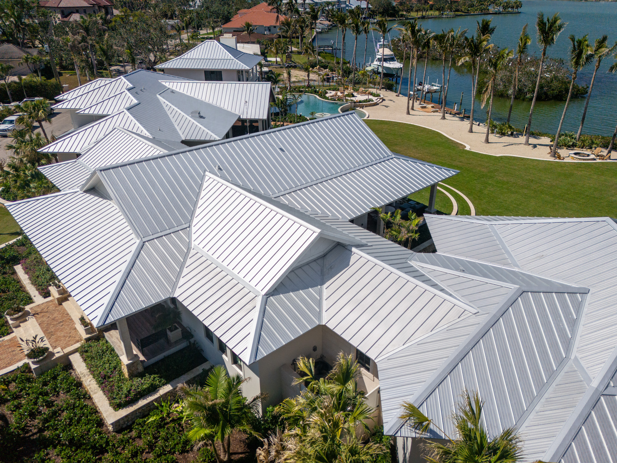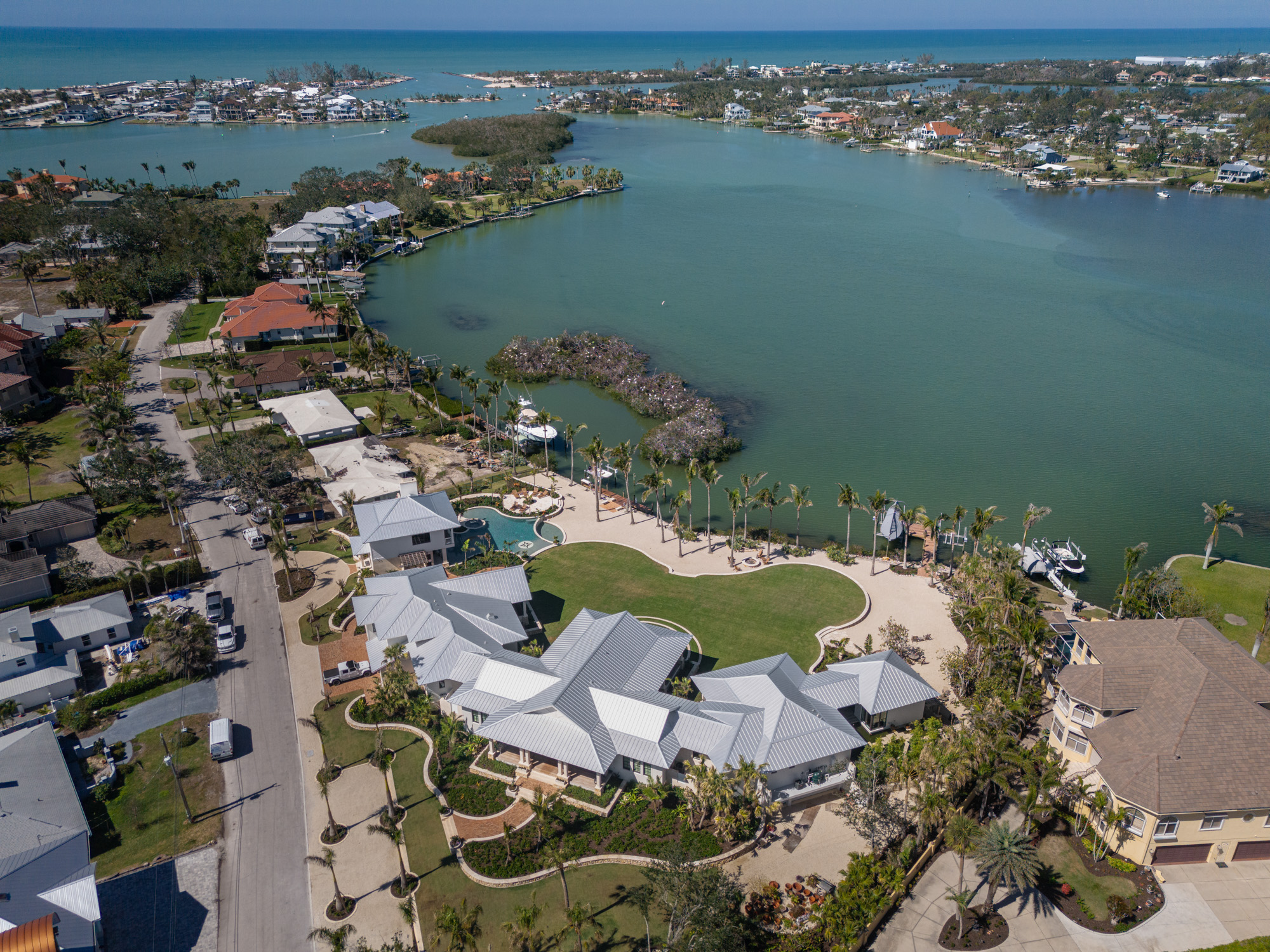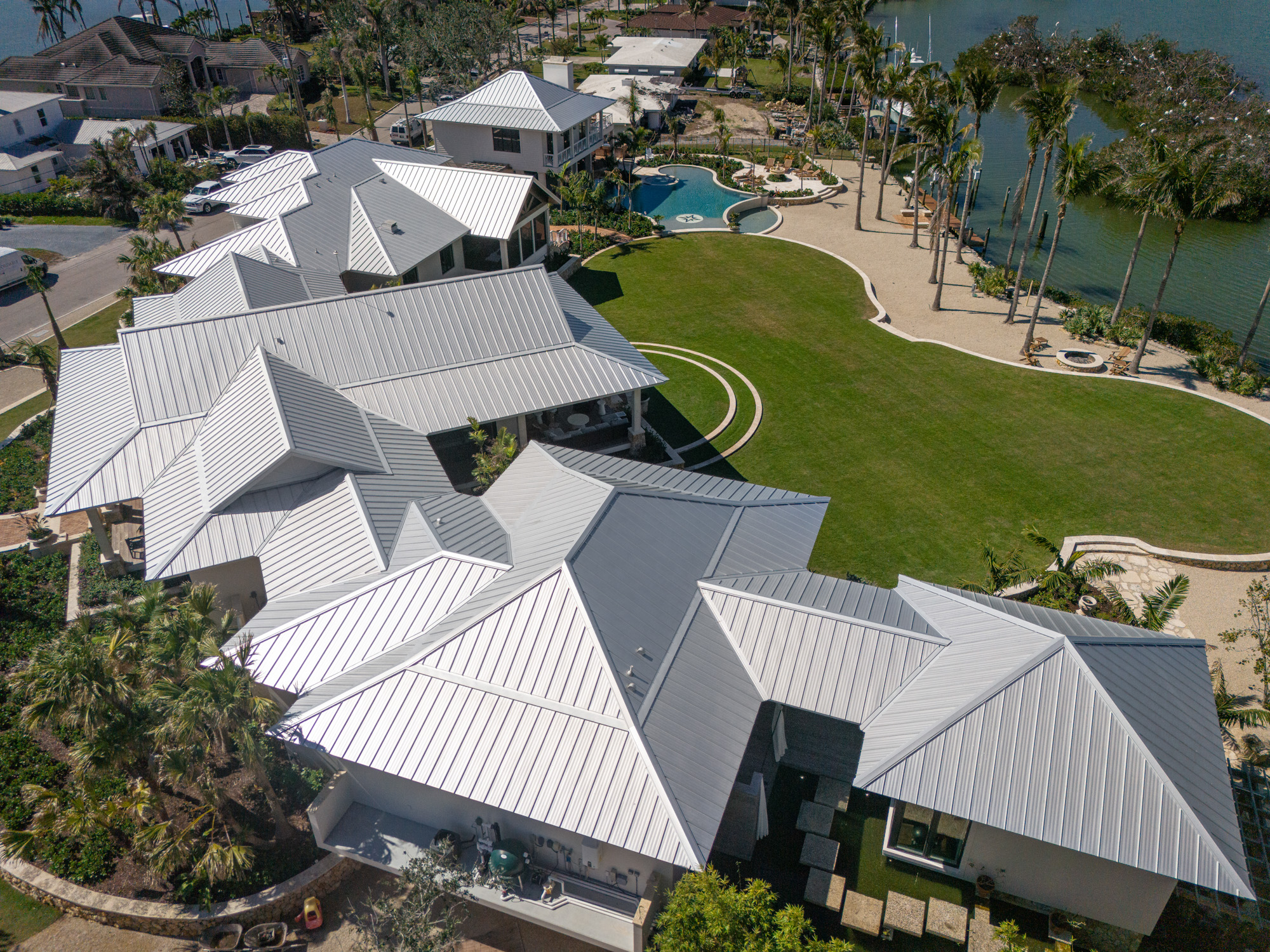 Aerial drone imagery showcases the sleek lines of a newly installed metal roof and the intricate craftsmanship of custom decorative railings at a stunning waterfront residence in Nokomis, Florida.