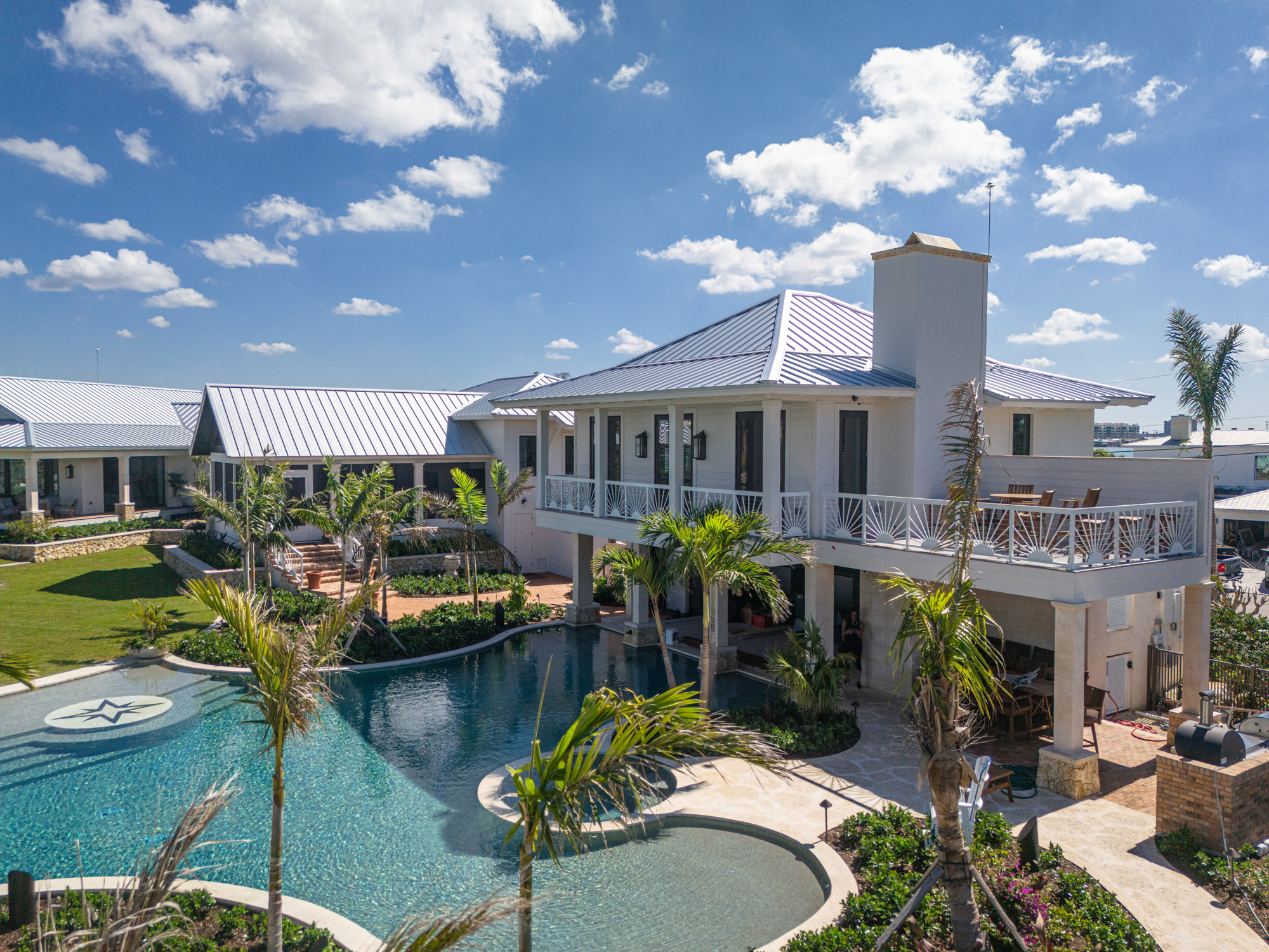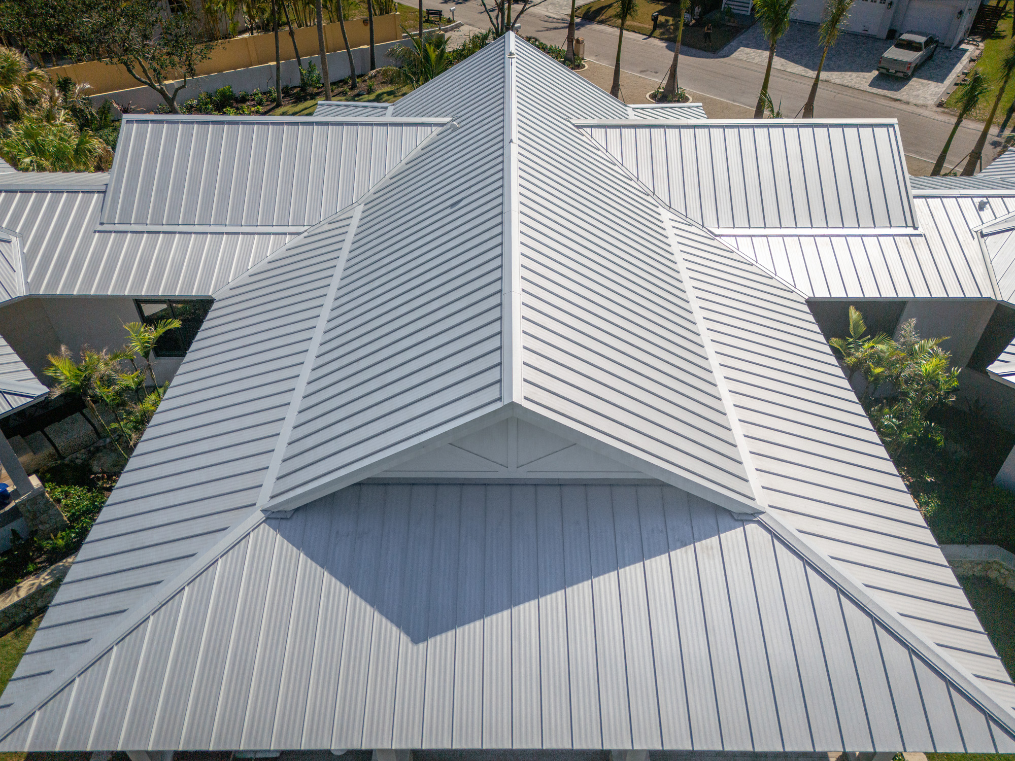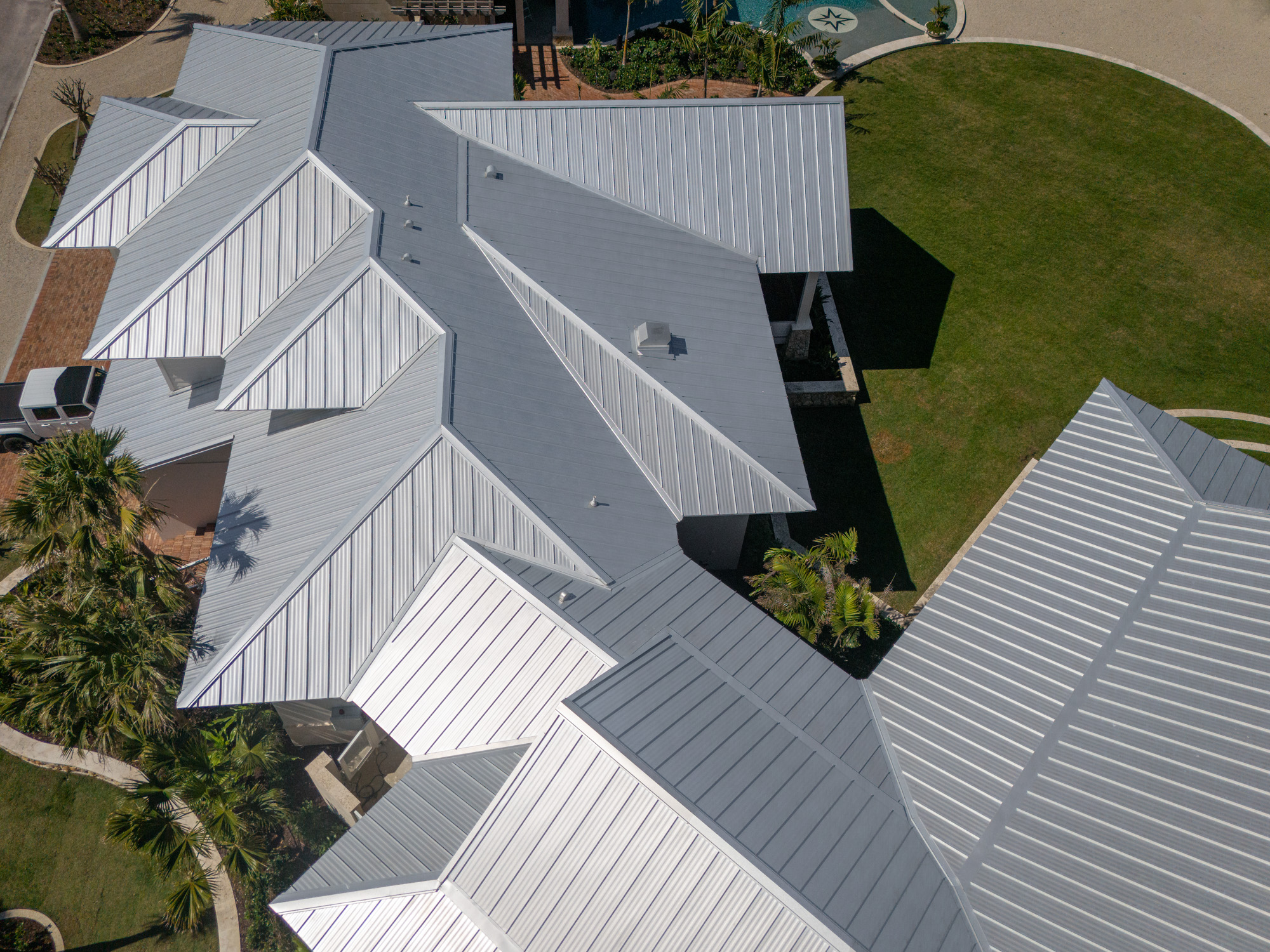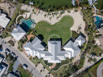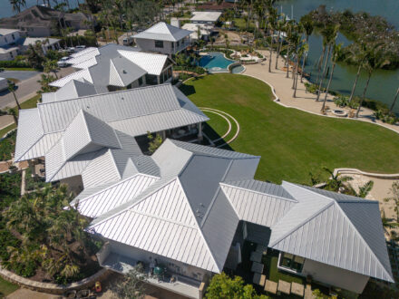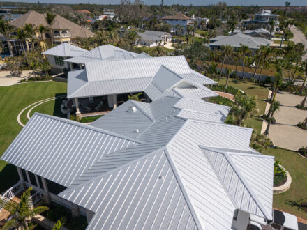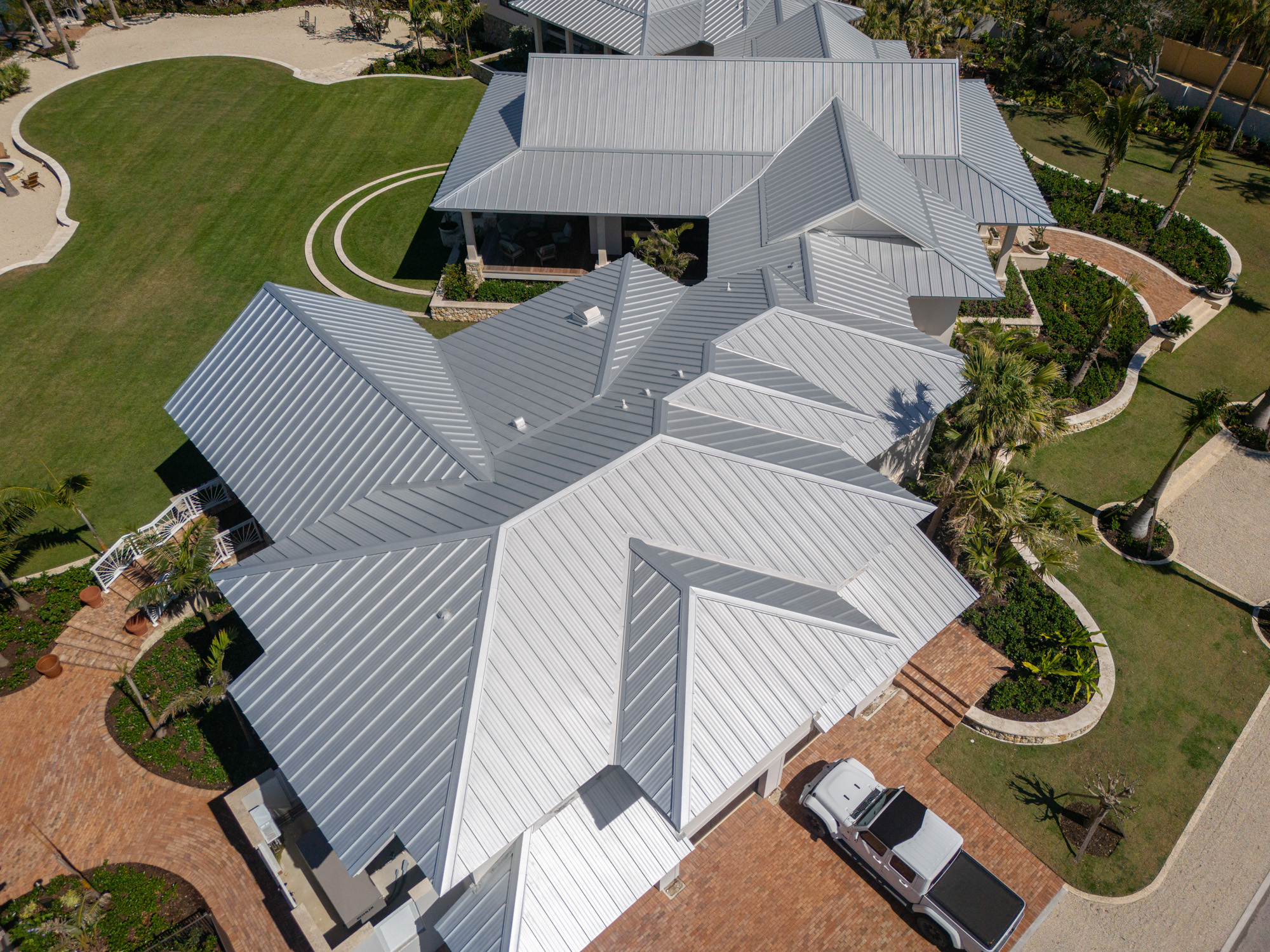 Aerial drone imagery showcases the sleek lines of a newly installed metal roof and the intricate craftsmanship of custom decorative railings at a stunning waterfront residence in Nokomis, Florida.