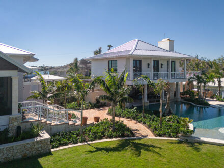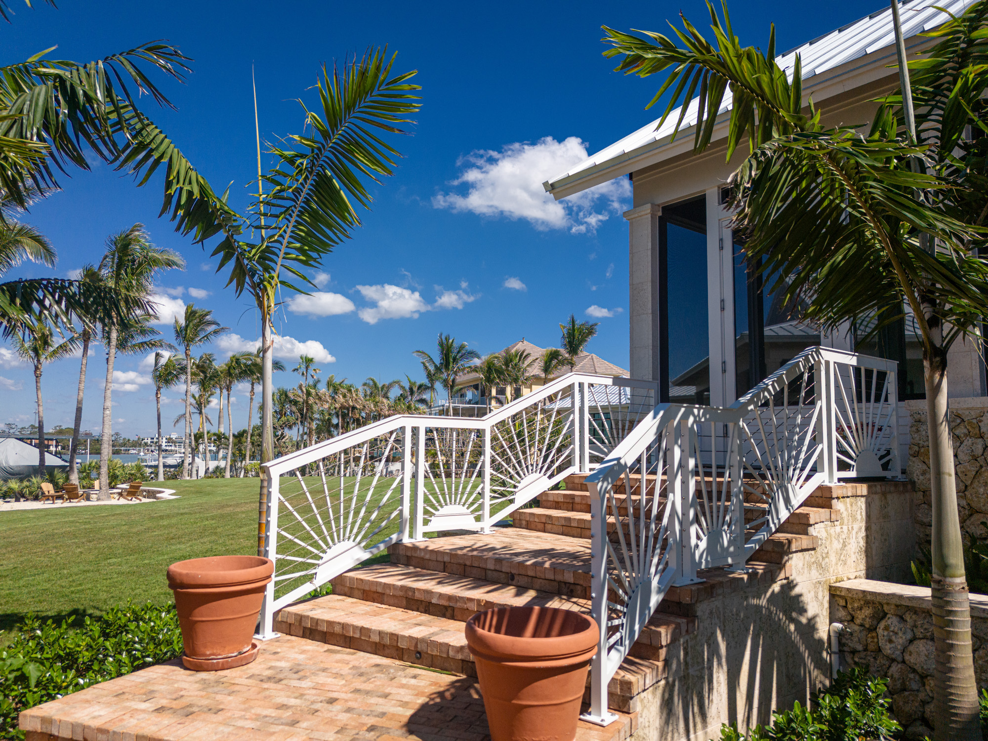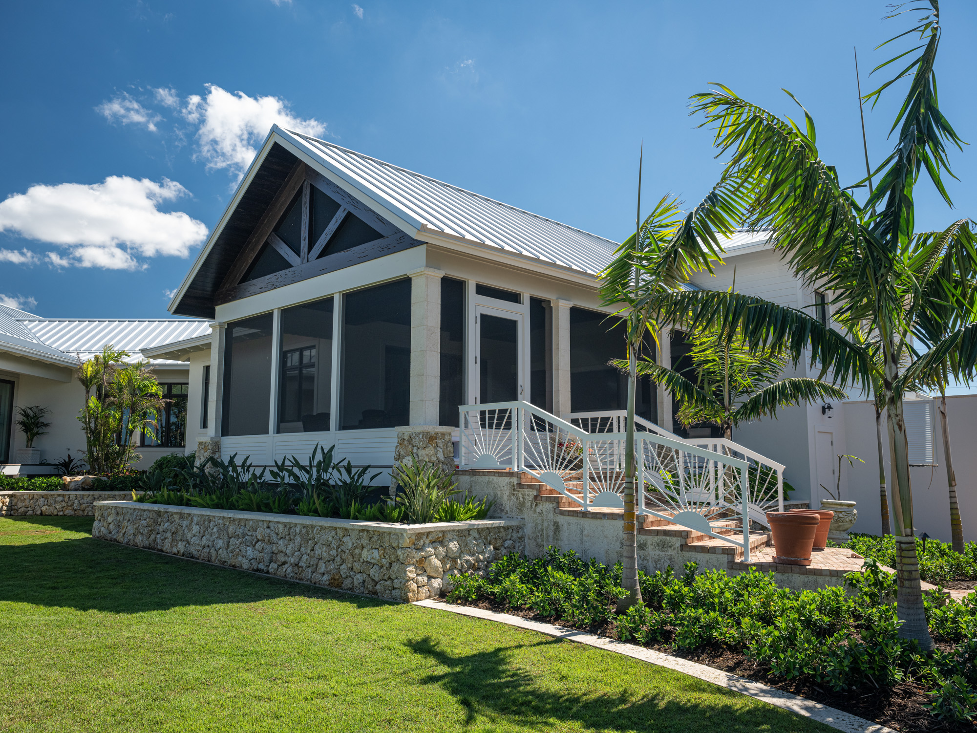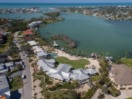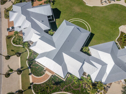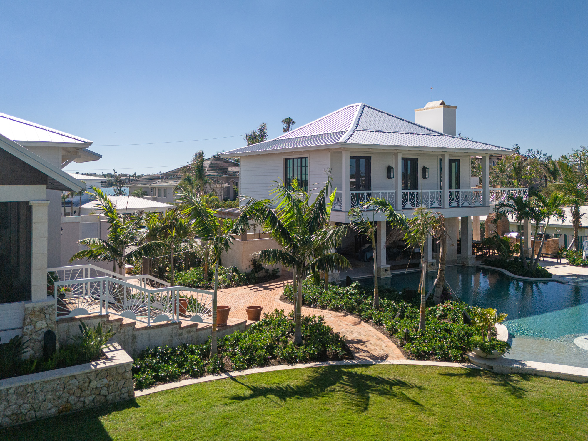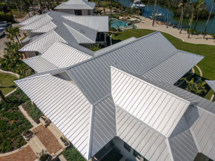 Aerial drone imagery showcases the sleek lines of a newly installed metal roof and the intricate craftsmanship of custom decorative railings at a stunning waterfront residence in Nokomis, Florida.